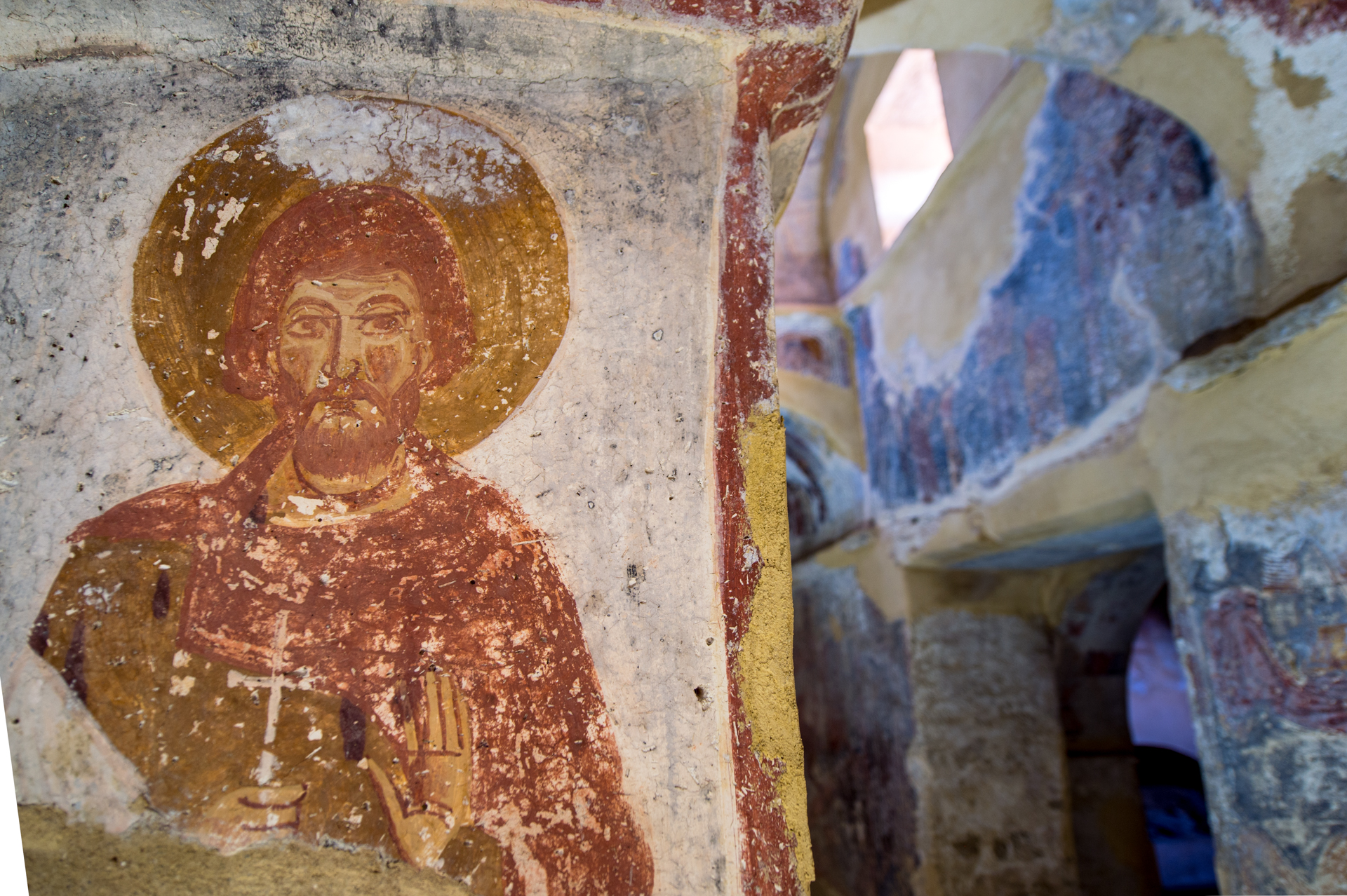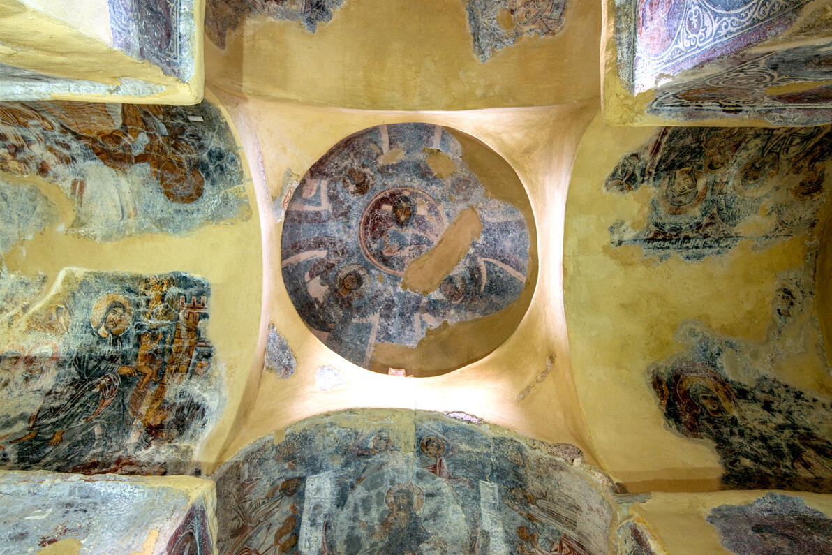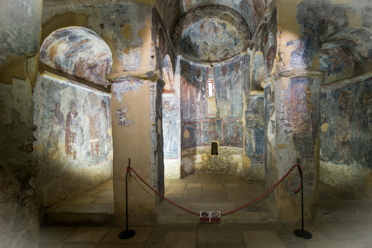 Im Innenraum der Kirche stehen Fresken hoher Qualität, die zu den wichtigsten Mengen dieser Zeit gezählt sind. Die Fresken zeichnen sich durch die Ruhe der Figuren mit den charakteristischen großen Augen, der Vielfalt der Farben und der originalen Darstellung der Themen. Mehr sind die Abbildungen der einzelnen Figuren, besonders die Abbildung Heiligen Georgios, Erzengels Michael, Johannes des Täufers. Die zusammengesetzten Darstellungen sind weniger. Die Fresken datieren von der zweiten Hälfte des 11.Jhs und sollten im 13.Jh. renoviert werden. Mit Fresken ist auch der Narthex dekoriert. Hauptthema hier ist das Jüngste Gericht, was auf den Grabcharakter der Kirche hinweist. Diese Fresken stammen aus mehr als einer Periode und die älteste datieren von dem 13.Jh. Die Kirche verfügte über eine elegante Marmorikonenwand, von der ausgemeißelte Brüstungen und Kapitell gefunden sind.
