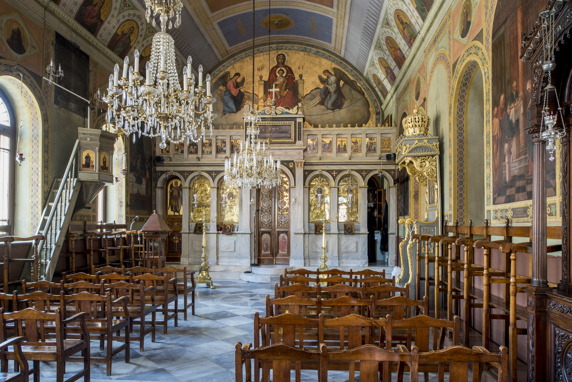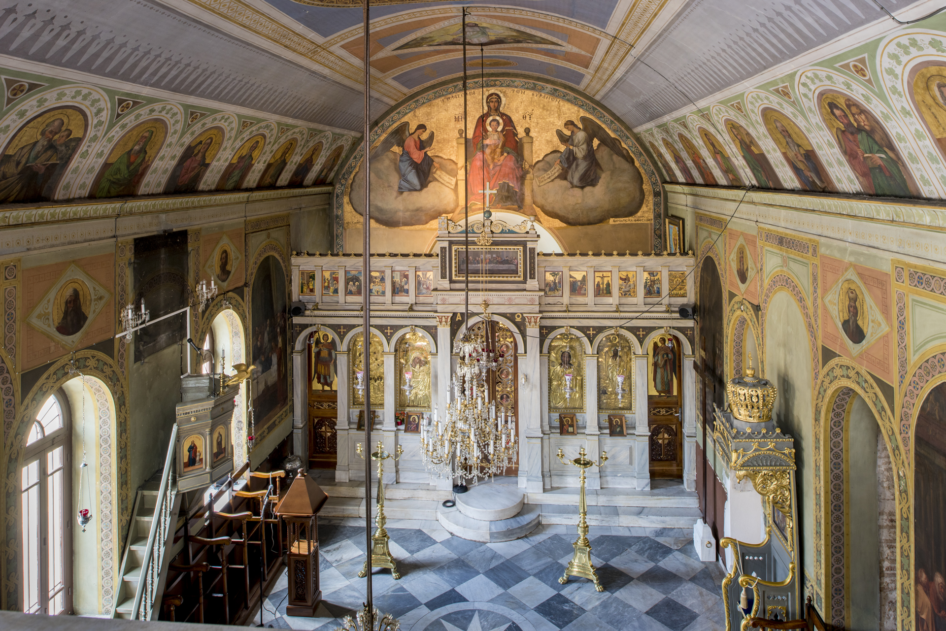 Im heutigen Bau der Kirche steht man im oberen Teil der zentralen Nische des Altarraums unweigerlich vor der Muttergottes, der  "Breiteren als der Himmel", wie es in der Inschrift auf der Vorderseite des Bogens heißt. Die Jungfrau Maria, die auf einem goldenen Grund dargestellt ist, sitzt auf einem Marmorthron und hält Jesus im Säuglingsalter. Die Jungfrau trägt eine grüne Tunika, die mit einer Goldstickerei abschließt, während ihr Kopf und ihre Schultern von einem purpurnen, fußlangen Schleier mit goldenen Borden bedeckt sind.
