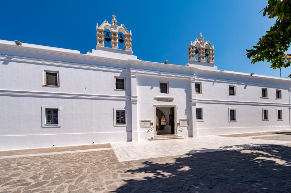 Die Kirche wurde in der ersten Hälfte des 4.Jhs, in der Zeit von Konstantin dem Großen, als Gelübde der Heiligen Helena gegründet, als diese während ihrer Pilgerreise ins Heilige Land auf der Insel Halt machte. Auf dieser Stelle stand schon eine kleine Kirche Mariä Himmelfahrt, wo Heilige Helena betete. Entweder Heilige Helena oder ihr Sohn baute diese imposante Kirche etwa später. Auf dem Gebäude steht die ganze Geschichte der Insel von der Antike bis heute. Sie ist auf den Ruinen eines antiken Tempels gebaut und zum Bau ihrer Wände wurde antikes Baumaterial benutzt. Die Kirche war ursprünglich eine dreischiffige Basilika mit Holzdach. In der Zeit aber von Justinian, im 6.Jh. wurde sie wieder hergestellt und das Holzdach wurde mit einer Kuppel und Wölbungen ersetzt. Auf dieselbe Weise wurden auch beide andere frühchristliche Gebäude verändert. Im ganzen Komplex wurden nachbyzantinische und spätere Anbaute erledigt, die den Stil der Eroberer und die traditionelle Architektur von Kykladen darstellen. Der letzte Anbau des Monumentes war seine Wiederaufrichtung von dem Architekten Anastasios Orlandos im Zeitraum 1959-1964.
