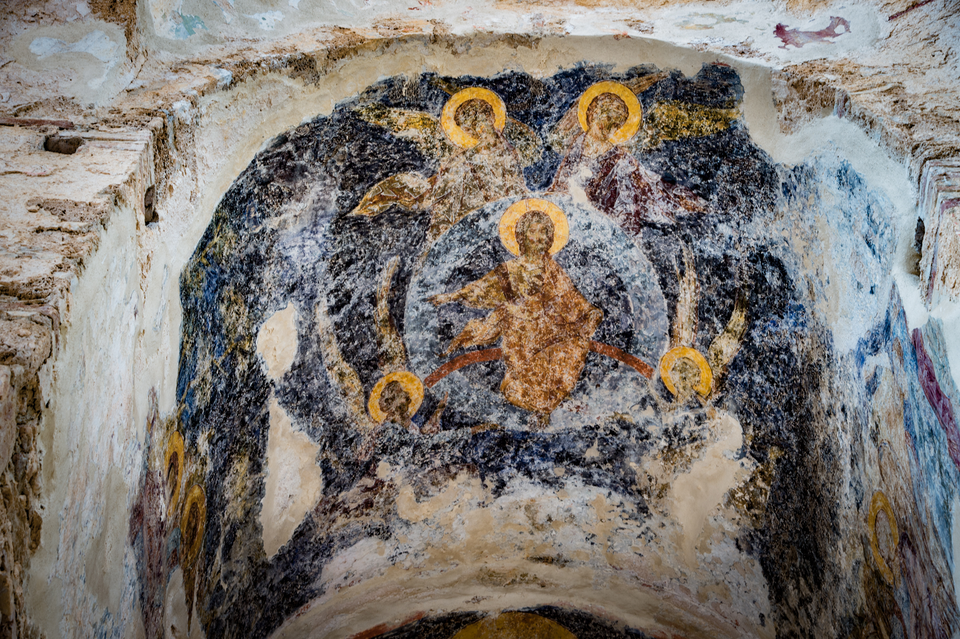 Στο εσωτερικό της σώζεται αποσπασματικά τοιχογραφίες, που χρονολογούνται στην περίοδο 1348-1354. Ανάμεσα στις παραστάσεις ιδιαίτερο ενδιαφέρον παρουσιάζει η απεικόνιση του ένθρονου Χριστού στην κόγχη του Ιερού Βήματος. Οι τοιχογραφίες των παρεκκλησίων είναι λίγο μεταγενέστερες. Τον επιμελημένο διάκοσμο του ναού συμπληρώνουν μαρμαροθετήματα και το επιστύλιο του τέμπλου, που χρονολογείται στο τέλος του 12ου αιώνα και προέρχεται από παλαιότερο μνημείο.
