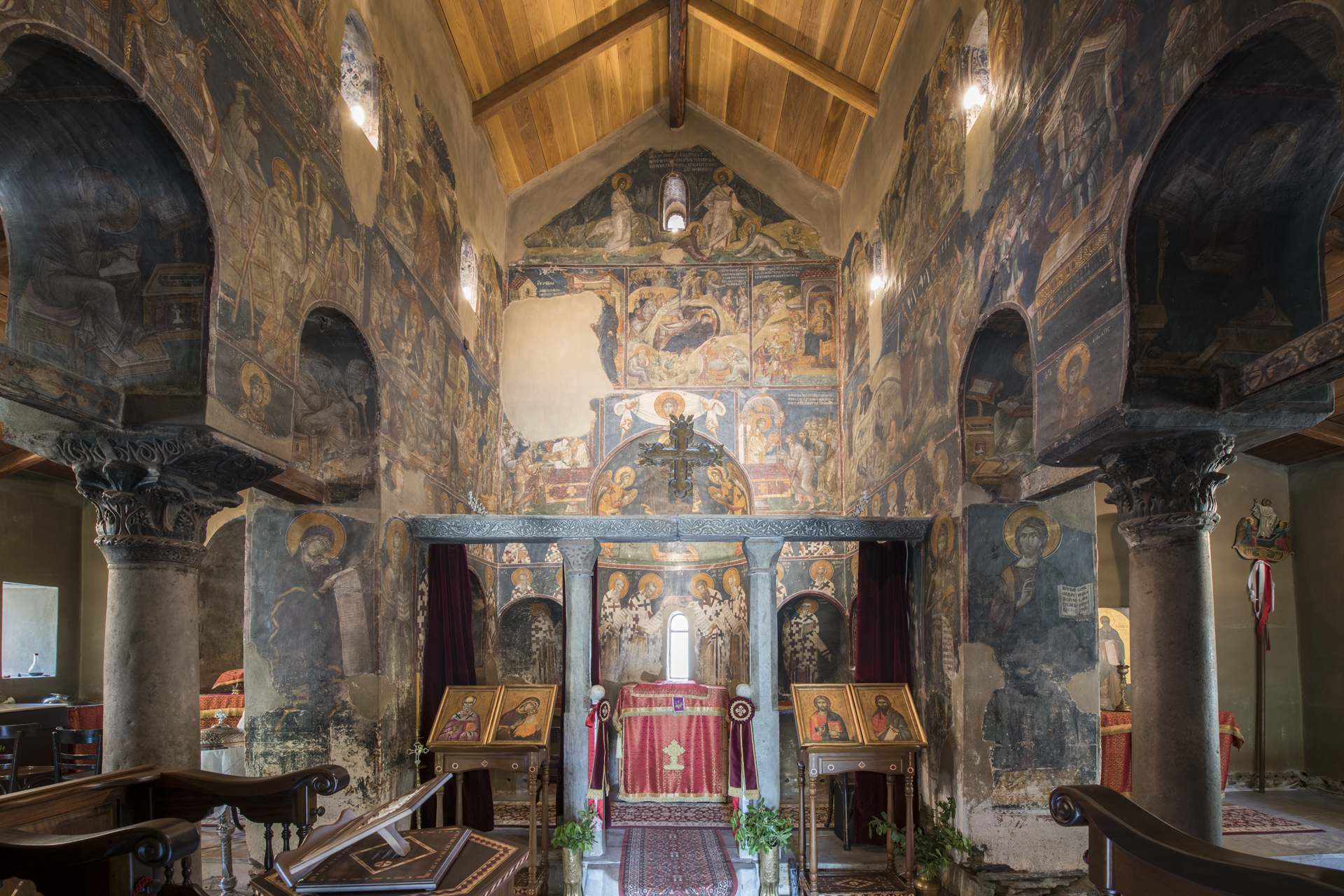 Στο εσωτερικό του ναού το μαρμάρινο τέμπλο χρονολογείται στην εποχή ίδρυσης του ναού, ενώ τα κιονόκρανα είναι της παλαιοχριστιανικής περιόδου.