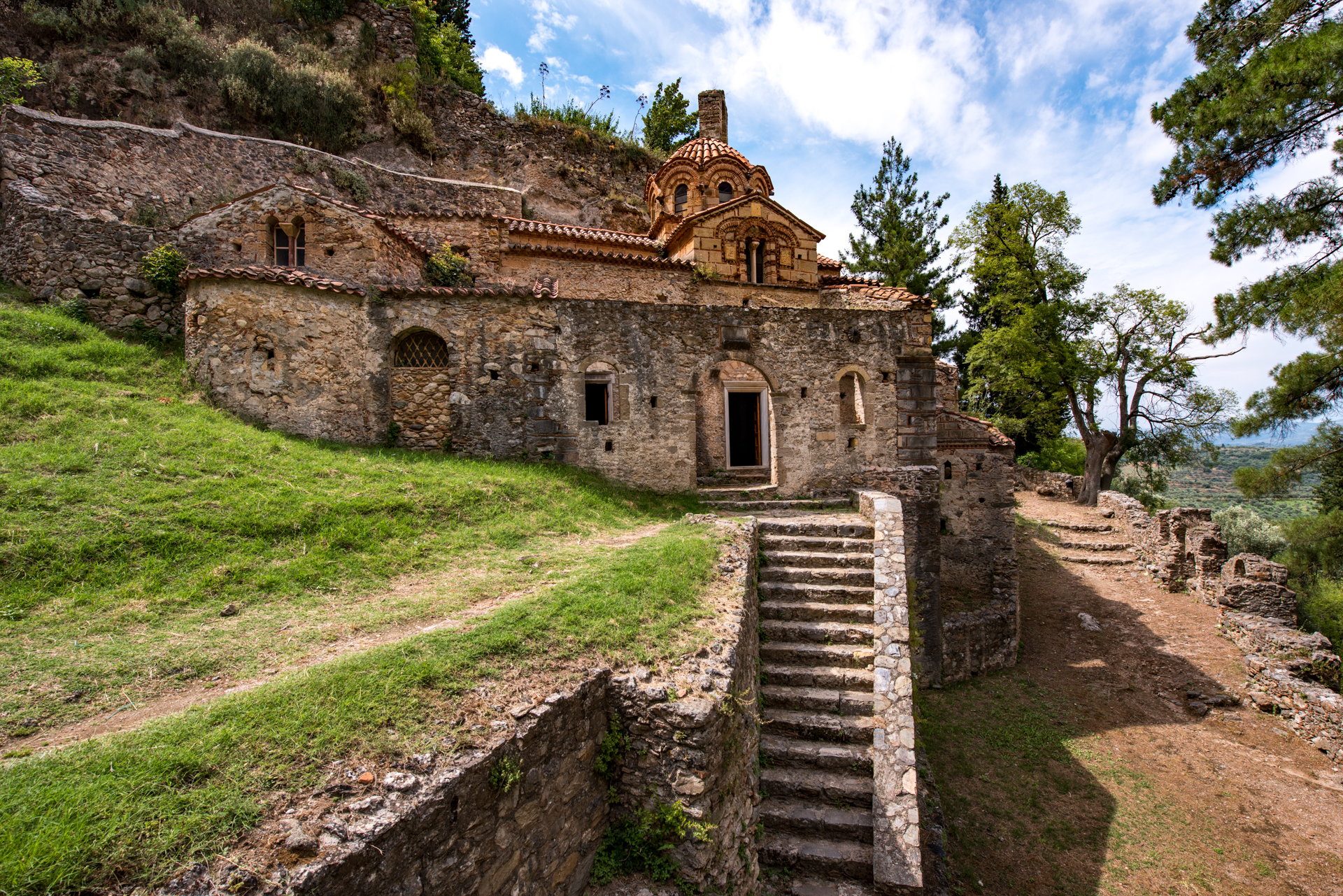 Στη νοτιοανατολική άκρη του λόφου του Μυστρά, στην Κάτω Πόλη, δίπλα στον απότομο βράχο, είναι κτισμένη η Μονή της Περιβλέπτου, αφιερωμένη στην Παναγία. Στο συγκρότημα οδηγεί ο δρόμος που έρχεται από τη Μητρόπολη και ο δρόμος που κατηφορίζει από τη Μονή της Παντάνασσας.