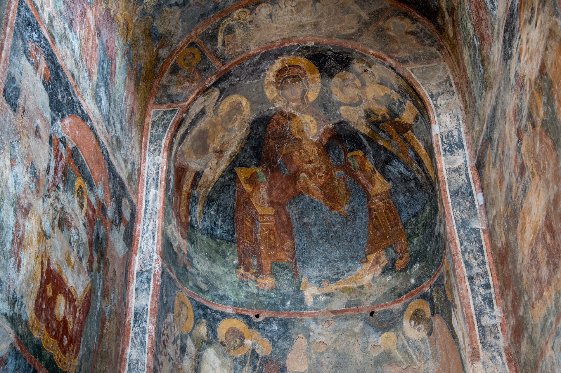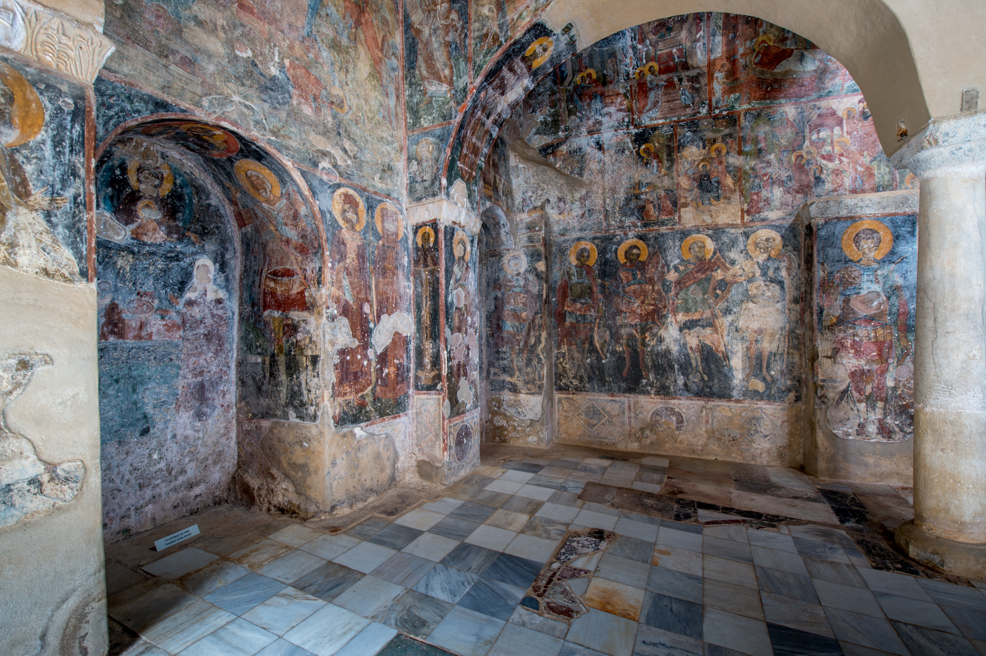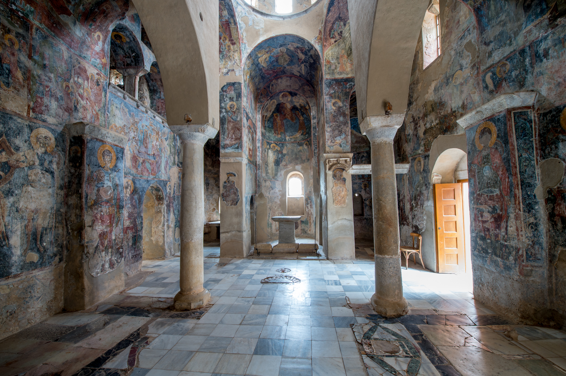 Το καθολικό ανήκει στον τύπο του απλού δικιόνιου σταυροειδούς εγγεγραμμένου ναού, με πεντάπλευρες αψίδες στο ιερό. Στη νότια πλευρά του αρχικά πρέπει να υπήρχε στοά, που αργότερα μετασκευάστηκε σε πλάγιο νάρθηκα, ίσως από τον Λέοντα Μαυρόπαππα, όπως δηλώνει το διπλό μονόγραμμα της οικογένειάς του. Μεταγενέστερα είναι τα παρεκκλήσια του ναού, του Αγίου Παντελεήμονα και της Αγίας Παρασκευής δίπλα στις αψίδες, και της Αγίας Αικατερίνης στα δυτικά, με ένα τμήμα του να εκτείνεται κάτω από τον βράχο. Οι τοίχοι του ναού είναι κτισμένοι σύμφωνα με το συνηθισμένο ελλαδικό πλινθοπερίκλειστο σύστημα. Το εσωτερικό του είναι πλούσια διακοσμημένο, με γλυπτά και τοιχογραφίες. Τα γλυπτά προέρχονται κυρίως από παλαιότερα μνημεία, ενώ ο τοιχογραφικός διάκοσμος, έργο τεσσάρων αγιογράφων, χρονολογείται περίπου στο έτος 1360. Αποτελεί ένα από τα σημαντικότερα σωζόμενα ζωγραφικά σύνολα του 14ου αιώνα και συνδέεται με την καλλιτεχνική παράδοση της Κωνσταντινούπολης.