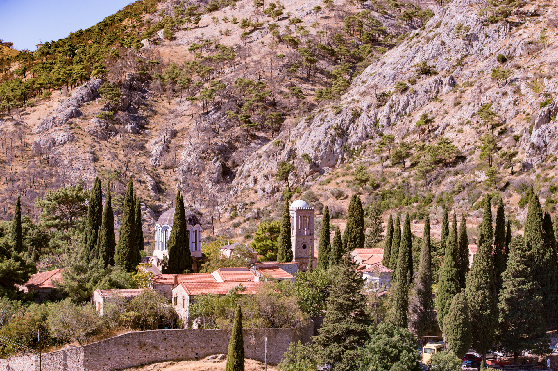 Στο κέντρο του μεγάλου συγκροτήματος δεσπόζει το καθολικό, που εγκαινιάσθηκε το 1049, και ξεχωρίζει για την αρχιτεκτονική του και τον ψηφιδωτό του διάκοσμο, που απηχούν την τέχνη της Κωνσταντινούπολης των μέσων του 11ου αιώνα. Αρχιτεκτονικά ανήκει στον τύπο του λεγόμενου «νησιώτικου» οκταγωνικού ναού και, σύμφωνα με την παράδοση, αντιγράφει τον μη σωζόμενο σήμερα ναό των «μικρών» Αγίων Αποστόλων στην Κωνσταντινούπολη. Χαρακτηριστικό του τύπου αυτού είναι ότι ο κυρίως ναός είναι ενιαίος χώρος, καθώς τα οκτώ στηρίγματα του τρούλου είναι προσκολλημένα στους τοίχους σαν παραστάδες. Στην ανατολική πλευρά του, το ιερό είναι τριμερές, ενώ στα δυτικά υπάρχουν δύο νάρθηκες, από τους οποίους ο εξωνάρθηκας απολήγει στα πλάγια σε ημικυκλικές κόγχες. Εξωτερικά, ακολουθεί την κωνσταντινοπολίτικη τοιχοποιία, από πελεκημένους λιθόπλινθους που εναλλάσσονται με σειρές οπτοπλίνθων. Ιδιαίτερο ενδιαφέρον παρουσιάζουν τα πλίνθινα τόξα, τα αψιδώματα και ο κεραμοπλαστικός διάκοσμος στα ανώτερα μέρη των τοίχων (σταυροί, ήλιος, μαίανδροι, αβακωτά πλέγματα κ.ά.). Ο εξωνάρθηκας, ο οποίος προστέθηκε στο μνημείο λίγα χρόνια αργότερα, ίσως στα χρόνια της αυτοκράτειρας Θεοδώρας (1055-1056), είναι κτισμένος με το πλινθοπερίκλειστο σύστημα τοιχοποιίας.