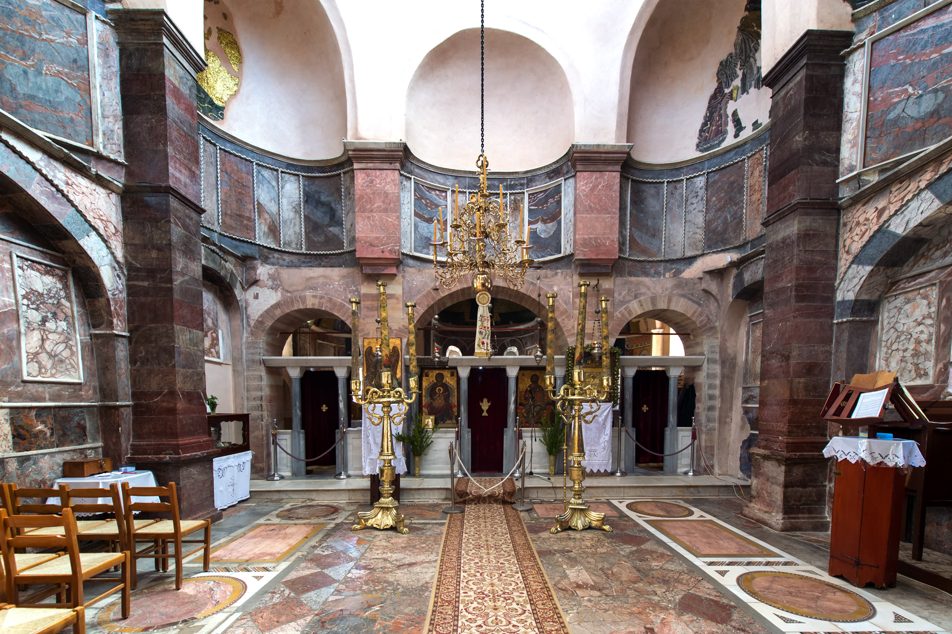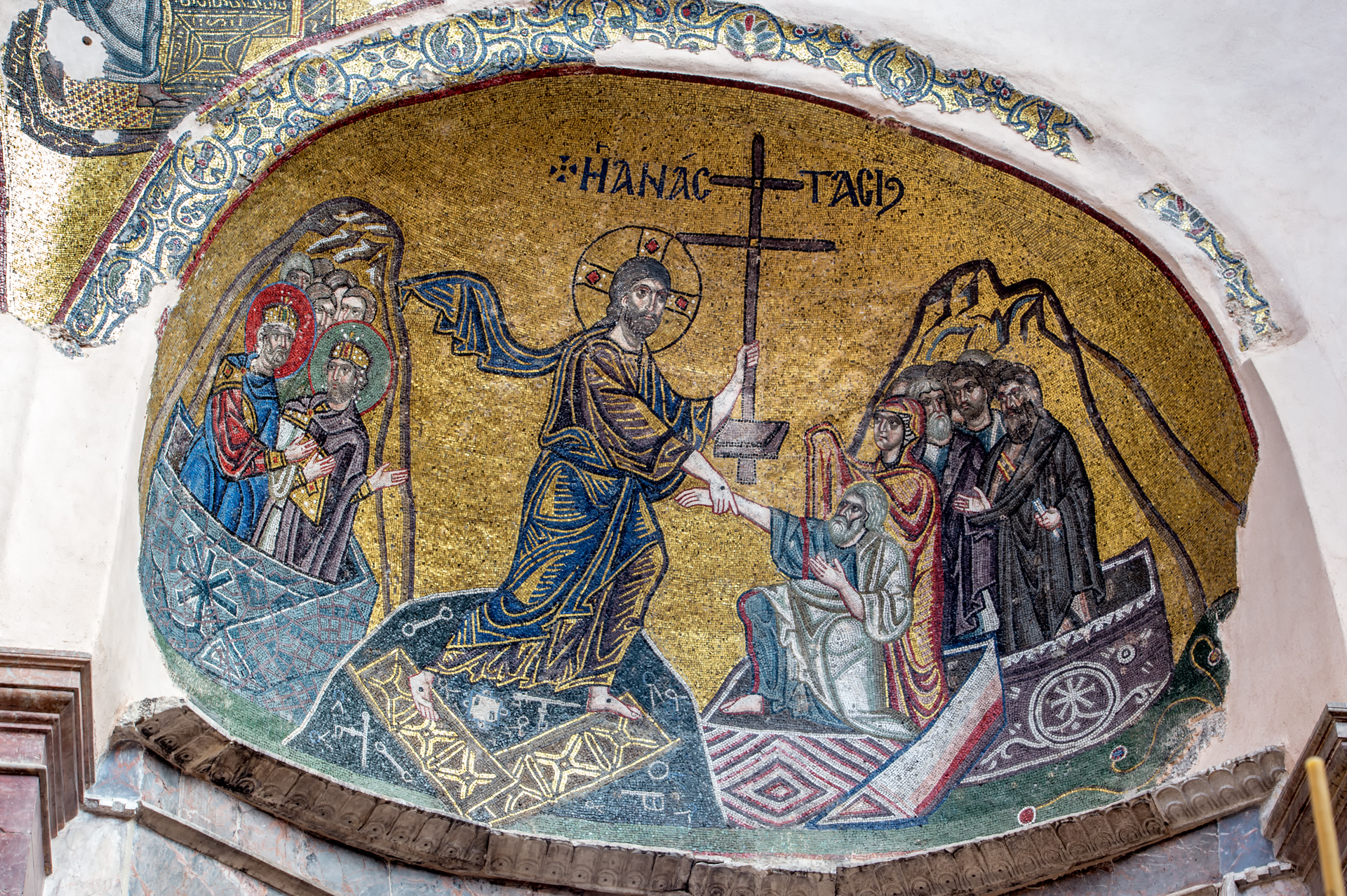 Ο ψηφιδωτός διάκοσμος του καθολικού, ο οποίος σήμερα σώζεται αποσπασματικά, χρονολογείται στα έτη 1049-1055, δηλαδή ολοκληρώθηκε μετά τον θάνατο του Κωνσταντίνου, την εποχή που αυτοκράτειρα ήταν η Θεοδώρα. Ψηφιδωτά υπάρχουν στα ανώτερα μέρη των τοίχων του κυρίως ναού και στα ανώτατα μέρη και στον τρουλίσκο του εσωνάρθηκα. Οι κατακόρυφοι τοίχοι του μνημείου αρχικά καλύπτονταν με πολύχρωμη ορθομαρμάρωση, η οποία καταστράφηκε το 1822 και σήμερα έχει αντικατασταθεί με επιζωγραφισμένα μαρμαροκονιάματα. Από τον ψηφιδωτό διάκοσμο διατηρούνται πολλές παραστάσεις: στο τριμερές Ιερό Βήμα η Θεοτόκος στην κόγχη του ιερού και οι αρχάγγελοι στις κόγχες της πρόθεσης και του διακονικού. Στον κυρίως ναό σκηνές από τη ζωή του Χριστού (η Βάπτιση, η Μεταμόρφωση, η Σταύρωση, η Αποκαθήλωση, η Ανάσταση). Οι σκηνές από τη ζωή του Χριστού συνεχίζουν και στον εσωνάρθηκα, στον βόρειο τοίχο (η Έγερση του Λαζάρου, η Βαϊοφόρος, ο Νιπτήρας) και στον νότιο τοίχο (η Προσευχή στη Γεσθημανή, η Προδοσία, η Ανάληψη, η Πεντηκοστή). Στον κέντρο του τρουλίσκου του εσωνάρθηκα εικονίζεται η Παναγία και στις άλλες επιφάνειες άγιοι. Στον εξωνάρθηκα σώζονται τμήματα τοιχογραφιών, των παλαιολόγιων και μεταβυζαντινών χρόνων. Στο δάπεδο του ναού σώζονται βυζαντινά μαρμαροθετήματα.