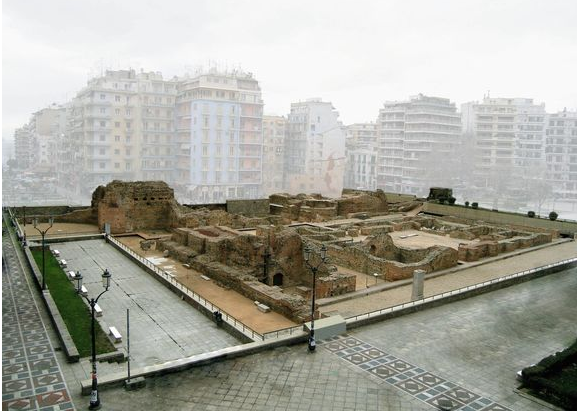 Στο κέντρο της Θεσσαλονίκης, στην Πλατεία Ναβαρίνου, ανάμεσα στα ψηλά σύγχρονα κτήρια σώζονται τα ερείπια του ανακτορικού συγκροτήματος που έκτισε το 305 ο Γαλέριος, ένας από τους Ρωμαίους αυτοκράτορες της τετραρχίας. Ο Γαλέριος έκανε πρωτεύουσά του τη Θεσσαλονίκη και κατασκεύασε ένα τεράστιο συγκρότημα, διοικητικό και θρησκευτικό κέντρο, στο οποίο ανήκαν η Ροτόντα, η θριαμβική αψίδα, και το ανάκτορο.