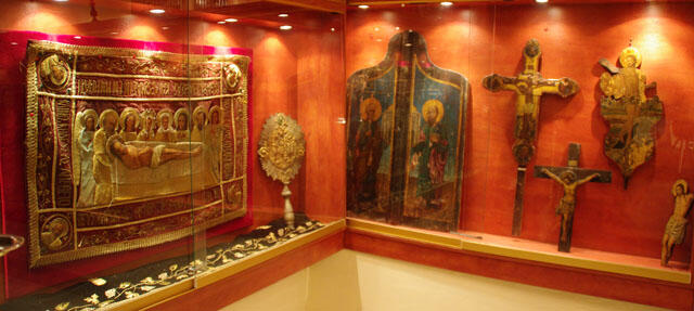 Στις προθήκες του φιλοξενούνται σημαντικά εκκλησιαστικά εκθέματα, τα οποία καλύπτουν τη λεγόμενη μεταβυζαντινή περίοδο από το 16ο έως και τον 20ο αιώνα. Ιδιαίτερα σημαντική είναι η συλλογή των φορητών εικόνων, όπως και ένας ξυλόγλυπτος Σταυρός, ο οποίος χρονολογείται από το 16ο αιώνα. Ο επισκέπτης μπορεί ακόμη να θαυμάσει διάφορα πολύτιμα ιερά σκεύη, καθώς και τη συλλογή Ευαγγελίων, τα περισσότερα από τα οποία τυπώθηκαν σε βενετσιάνικα τυπογραφεία κατά το 18ο αιώνα.