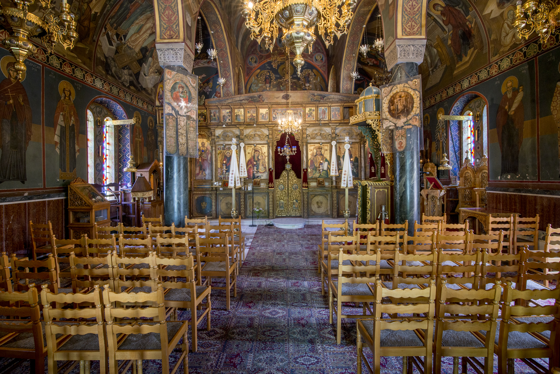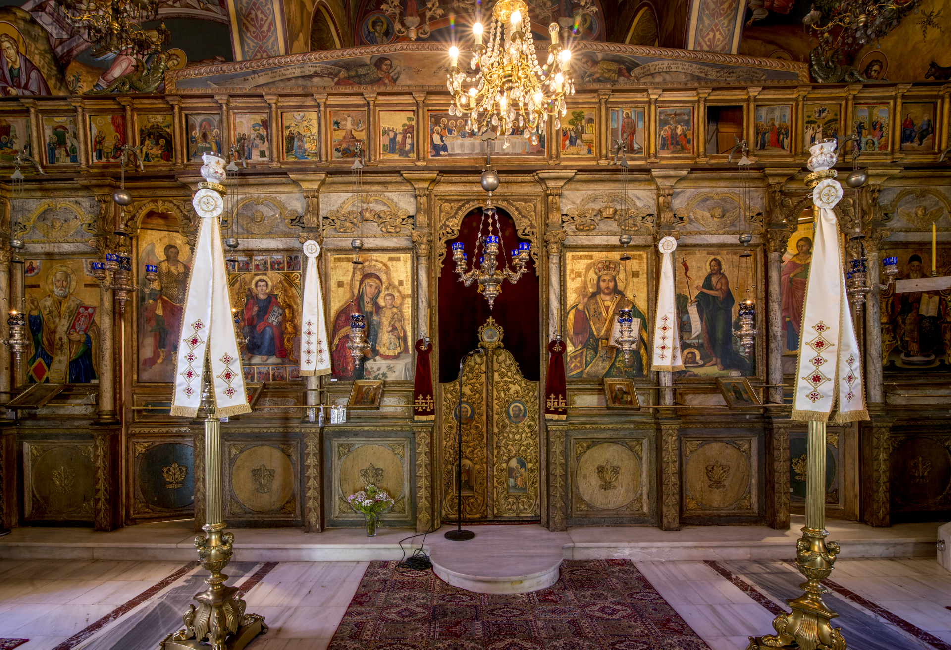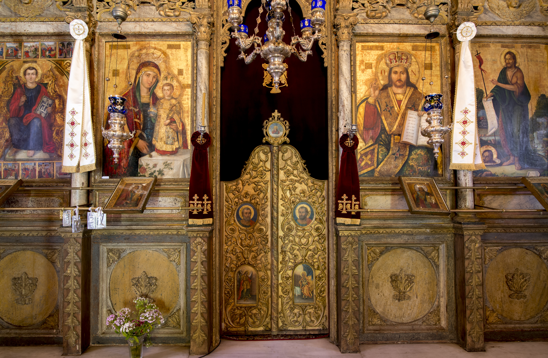 Το εξαιρετικό ξυλόγλυπτο τέμπλο και το δεσποτικό, με εμφανείς τις νεοκλασικές επιδράσεις και την πλούσια διακοσμητικότητα, είναι έργο του 1842. Οι εικόνες του τέμπλου αποτελούν έργο του δεύτερου μισού του 15ου αιώνα και αντανακλούν τις καλλιτεχνικές τάσεις εκείνης της περιόδου, ενώ επιδράσεις από την Δυτική τέχνη είναι εμφανείς στον τρόπο με τον οποίο έχουν πλαστεί τα πρόσωπα και φιλοτεχνηθεί τα μοτίβα των ενδυμάτων.