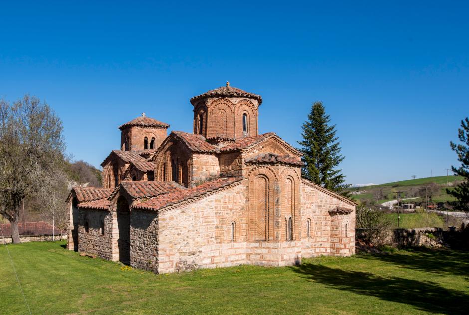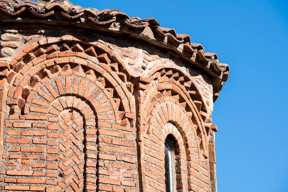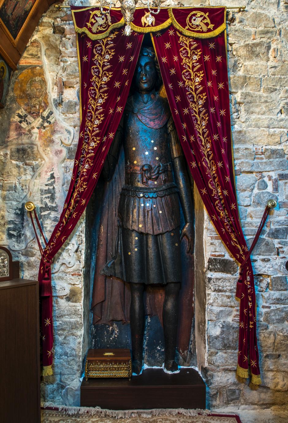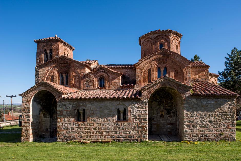 Στην αρχική του μορφή, ο ναός ήταν σταυροειδής εγγεγραμμένος, με τρούλο που στηρίζουν δύο κίονες. Στα ανατολικά εξείχε τρίπλευρη αψίδα και στα δυτικά υπήρχε νάρθηκας και κωδωνοστάσιο. Αργότερα, πιθανόν τον 13ο αιώνα, προστέθηκε ο εξωνάρθηκας, και προσκτίσματα στη βόρεια και νότια πλευρά, που ανατολικά απολήγουν σε παρεκκλήσια και αρχικά πρέπει να είχαν τη μορφή ανοικτής στοάς. Στο μεγαλύτερο μέρος του ο ναός είναι κτισμένος σύμφωνα με το πλινθοπερίκλειστο σύστημα και έχει πλούσια κεραμοπλαστική διακόσμηση. Στο εσωτερικό του είναι διακοσμημένος με τοιχογραφίες που ανήκουν σε διαφορετικές φάσεις. Οι αγιογραφίες του αρχικού ναού, του νάρθηκα και του ορόφου του κωδωνοστασίου χρονολογούνται προς τα τέλη του 13ου αιώνα, η ζωγραφική του εξωνάρθηκα ανάγεται στις αρχές του 14ου αιώνα, και οι εξωτερικές τοιχογραφίες χρονολογούνται στο διάστημα 1365-1385. Ιδιαίτερα σημαντική είναι η μοναδική στο είδος της ξυλόγλυπτη θαυματουργή εικόνα του Αγίου Γεωργίου, με το εντυπωσιακό ύψος που φθάνει περίπου στα 3 μ. Η προέλευσή της συνδέεται με διάφορες παραδόσεις, και είναι χαρακτηριστικό ότι οι πιστοί ακουμπούν επάνω της κέρματα, που αν κολλήσουν, θεωρείται ότι έχουν εκπληρωθεί οι ευχές τους.