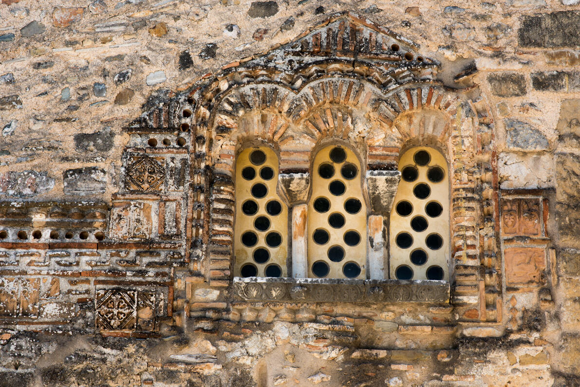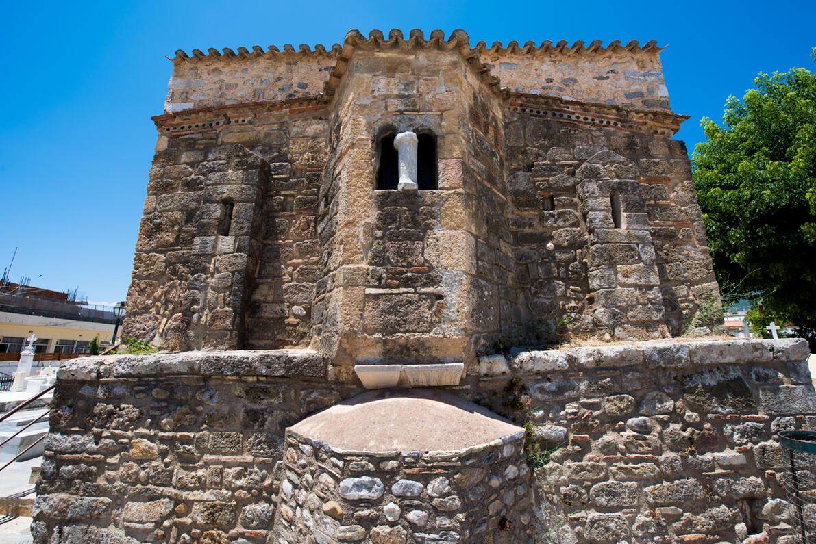 Ο βυζαντινός ναός, που αποτελεί το ιερό του σύγχρονου, καταλάμβανε τον όροφο του διώροφου κτίσματος και ανήκε στον τύπο του σταυροειδούς εγγεγραμμένου. Ο τρούλος του στηριζόταν σε δύο ή τέσσερις κίονες αλλά σήμερα έχει καταρρεύσει και ο χώρος στεγάζεται με επικλινή στέγη. Από αυτό τον ναό διατηρείται ο ανατολικός και το κατώτερο μέρος των πλαϊνών τοίχων. Το ισόγειο του κτηρίου είναι λίγο μεγαλύτερο, σχεδόν τετράγωνο σε κάτοψη, εν μέρει κάτω από την επιφάνεια του εδάφους. Στεγαζόταν με χαμηλό θόλο και είχε μεγάλα τοξωτά ανοίγματα σε όλες τις πλευρές, στοιχείο που δυσκολεύει την εξακρίβωση της χρήσης του. Η τοιχοποιία του ναού είναι κατασκευασμένη από λαξευμένους λίθους και διαθέτει πλούσια κεραμοπλαστική διακόσμηση, οδοντωτές ταινίες, σταυρούς και πήλινες ανάγλυφες πλάκες.