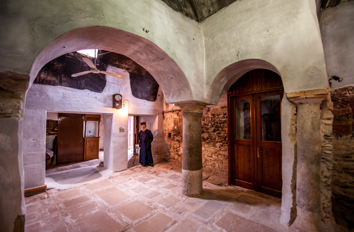 Το εσωτερικό του διακοσμείται με αγιογραφίες του 17ου αιώνα, που ακολουθούν την τεχνοτροπία της Κρητικής Σχολής της ζωγραφικής, ενώ ενδιαφέρον είναι και το ξυλόγλυπτο τέμπλο, που κατασκευάσθηκε μάλλον στα μέσα του 19ου αιώνα. Στην αριστερή πλευρά του ναού υπάρχει μικρό παρεκκλήσι με τον τάφο του οσίου Ονουφρίου, που ήλθε στη μονή στα τέλη του 18ου αιώνα. Από το πλούσιο συγκρότημα διατηρείται ακόμη το πηγάδι, που σύμφωνα με την παράδοση κατασκεύασε ο ίδιος ο Όσιος Ονούφριος, και ερείπια από τους βοηθητικούς χώρους που προστέθηκαν κατά τον 19ο αιώνα, ανάμεσα στους οποίους ήταν το ελαιοτριβείο και ένα διώροφο κτίσμα για τη διαμονή των μοναχών.
