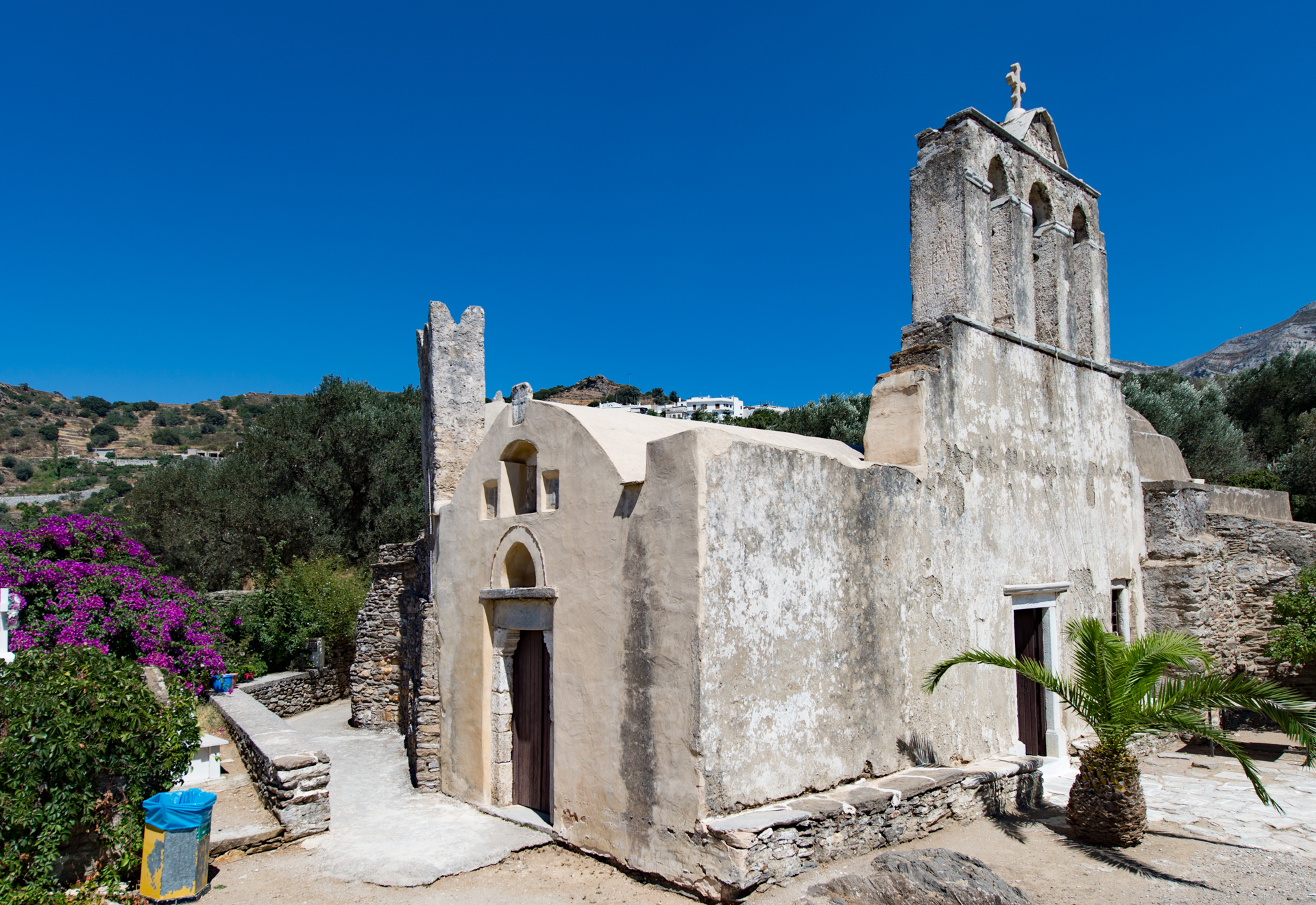 Χρονολογείται στον 6ο ή 7ο αιώνα και αρχικά ήταν μικρός, μονόχωρος ναός με τρούλο, που με τα διαδοχικά προσκτίσματα έχει διαμορφωθεί σε πιο πολύπλοκο αρχιτεκτονικό σύνολο. Είναι ο μοναδικός στη Νάξο τρίκογχος ναός, δηλαδή έχει μία κόγχη σε κάθε μία από τις τρεις πλευρές, και το μοναδικό κτήριο με τρούλο της εποχής αυτής. Σε μεταγενέστερη φάση, στη δυτική πλευρά του προστέθηκε καμαροσκεπής επέκταση με κωδωνοστάσια επάνω από τις θύρες. Αργότερα, άγνωστο ακριβώς πότε, στον βόρειο τοίχο της επέκτασης προσκολλήθηκαν τρία μονόχωρα παρεκκλήσια, τα δύο επίσης τρίκογχα, στεγασμένα με τρούλους. Το ένα από αυτά είχε χρησιμοποιηθεί ως οστεοφυλάκιο και στο εσωτερικό του διατηρούνται τμήματα τοιχογραφιών. Οι τοίχοι του ναού είναι κτισμένοι με αδέξιο και άτεχνο τρόπο, από ακατέργαστους πλακοειδείς λίθους, όπως και οι τρούλοι, που είναι σχεδόν κωνικοί και στηρίζονται σε βαριά κυβικά τύμπανα.
