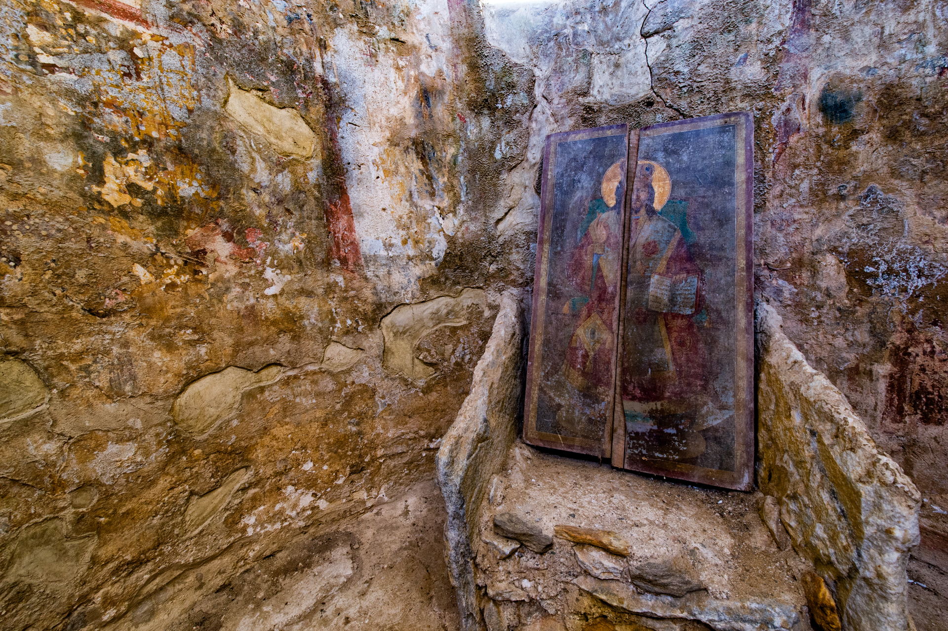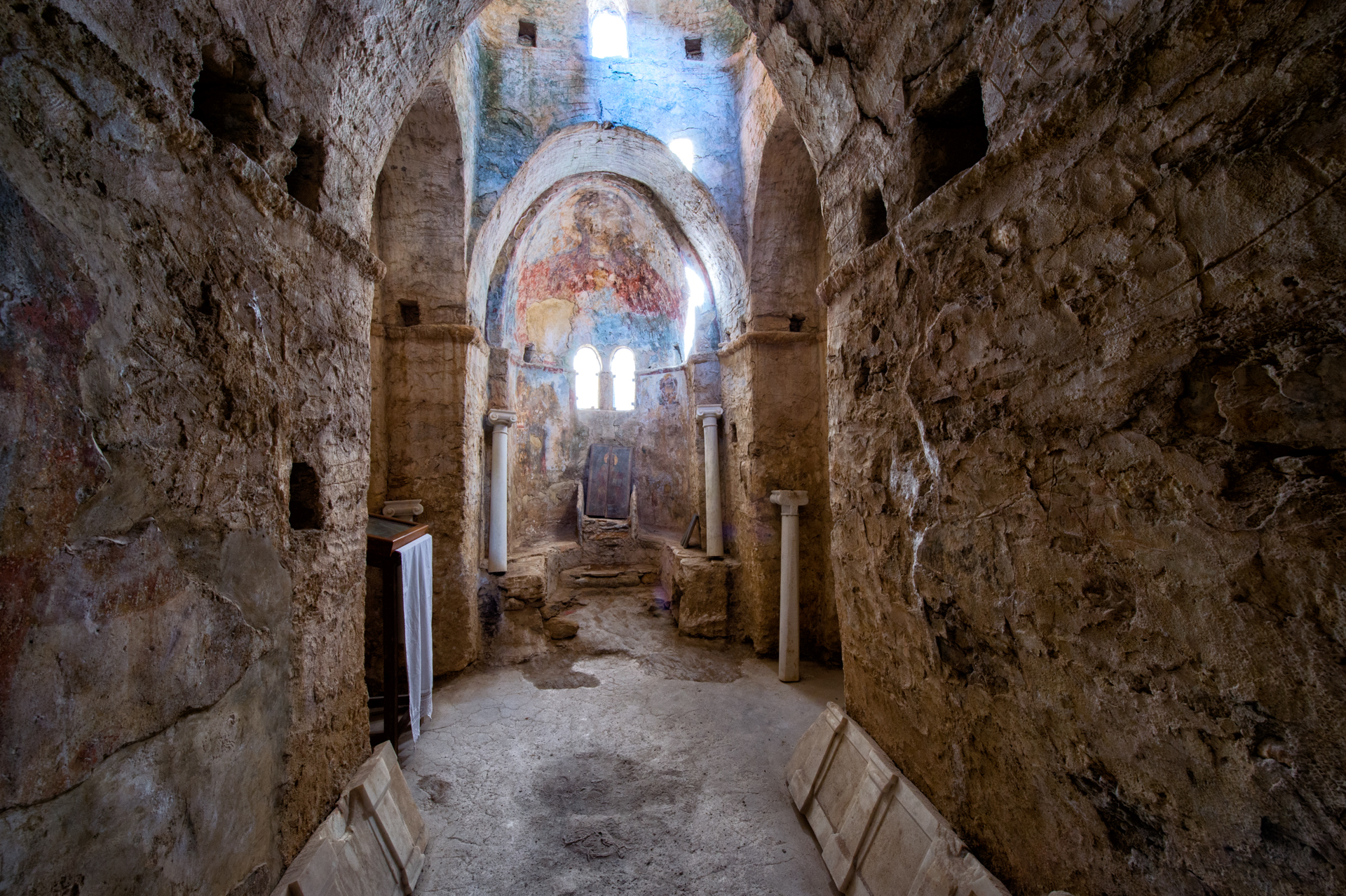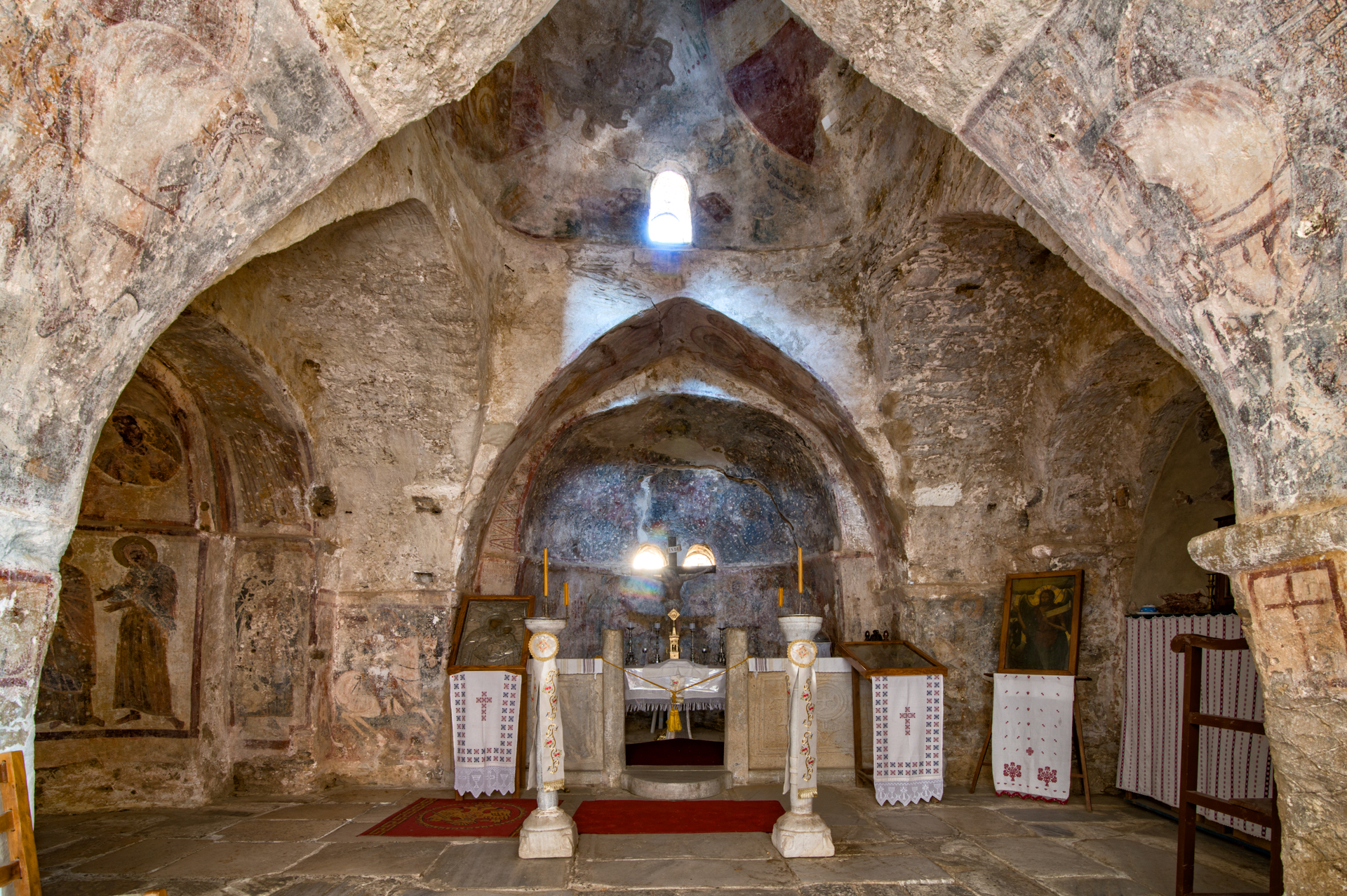 Στο εσωτερικό του ναού, στον τρούλο και στο ιερό, έχουν αποκαλυφθεί οι αρχικές τοιχογραφίες, του 7ου αιώνα. Απαρτίζουν το πληρέστερα σωζόμενο εικονογραφικό πρόγραμμα της εποχής, που παρουσιάζει και αρκετές μοναδικές ιδιομορφίες, όπως η παράσταση του Χριστού ως νέου και ως ώριμου άνδρα, σε δύο στηθάρια στον τρούλο. Μεγάλο ενδιαφέρον παρουσιάζει και η διακόσμηση της βόρειας κόγχης του ιερού, όπου εικονίζεται η Παναγία Νικοποιός και η Δέηση με πέντε ολόσωμες μορφές. Κύρια χαρακτηριστικά των πρώιμων αυτών τοιχογραφιών είναι η ηρεμία, η κομψότητα και η χάρη των μορφών και η ισορροπία των χρωμάτων. Από επιγραφές που διατηρούνται στο εσωτερικό του ναού είναι γνωστό ότι η εικονογράφηση αυτή έγινε με τη χορηγία πολλών δωρητών, και του επισκόπου Σισινίου. Οι αρχικές τοιχογραφίες καλύφθηκαν με αλλεπάλληλα στρώματα τοιχογραφιών που φθάνουν χρονολογικά έως τον 14ο αιώνα.
