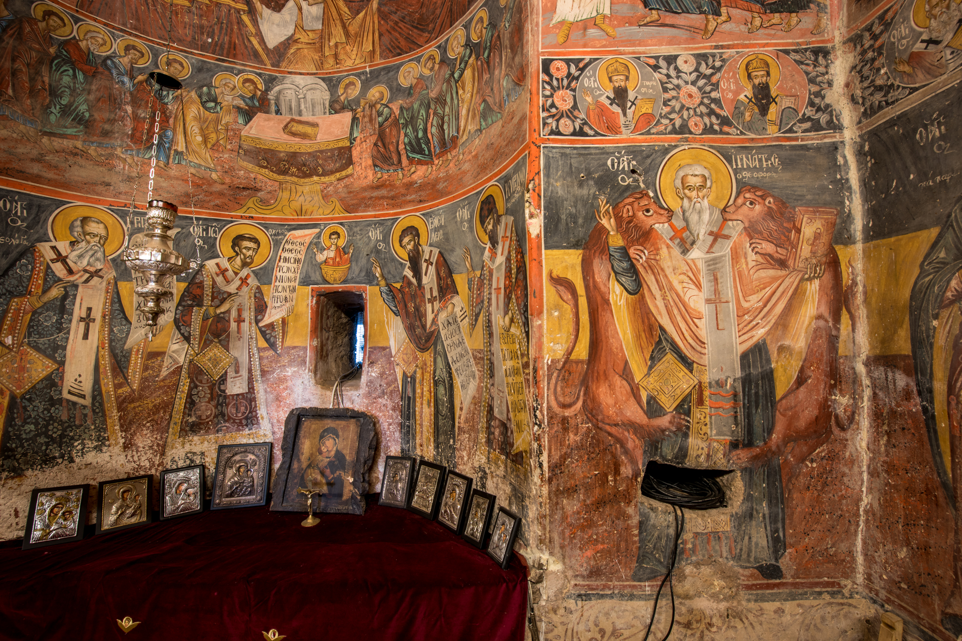 Στο εσωτερικό του ναού, μέσα σε φυσικό κοίλωμα στο τοίχωμα του πλατάνου, έχει αποτυπωθεί με θαυμαστό τρόπο η εικόνα της Παναγίας Βρεφοκρατούσας. Η εικόνα αυτή είναι πανομοιότυπη με την εικόνα της Μονής Μεγάλου Σπηλαίου, για την ακρίβεια αποτελεί το αρνητικό αποτύπωμά της. Για τον τρόπο δημιουργίας της υπάρχουν διάφορες παραδόσεις, που σχετίζονται είτε με τους ιδρυτές της μονής, μοναχούς Συμεών και Θεόδωρο, που διανυκτέρευσαν στον πλάτανο κατά την προσπάθειά τους να βρουν την εικόνα, τον 4ο αιώνα, ή με τους μοναχούς της μονής, που γύρω στον 9ο αιώνα περιέφεραν τη θαυματουργή εικόνα έπειτα από τη διάσωσή της από τους εικονομάχους, και επίσης διανυκτέρευσαν στην προστατευμένη κοιλότητα του πλατάνου.