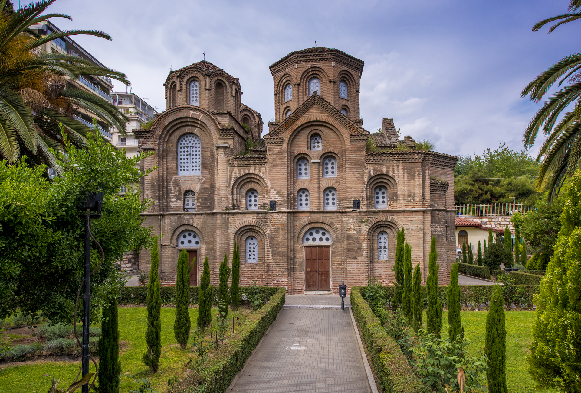 Ιδιαίτερο ενδιαφέρον παρουσιάζουν οι εξωτερικές όψεις του ναού, οι οποίες ελαφρύνονται από επάλληλα καμπύλα τόξα και αψιδώματα, κόγχες και ημικυκλικούς κίονες, όπως συνηθίζεται στα μνημεία της Κωνσταντινούπολης. Ο ναός είναι κτισμένος εξολοκλήρου με τούβλα (πλίνθους), κάτι το οποίο υποδηλώνει ότι πρόκειται για ιδιαίτερα δαπανηρή κατασκευή.