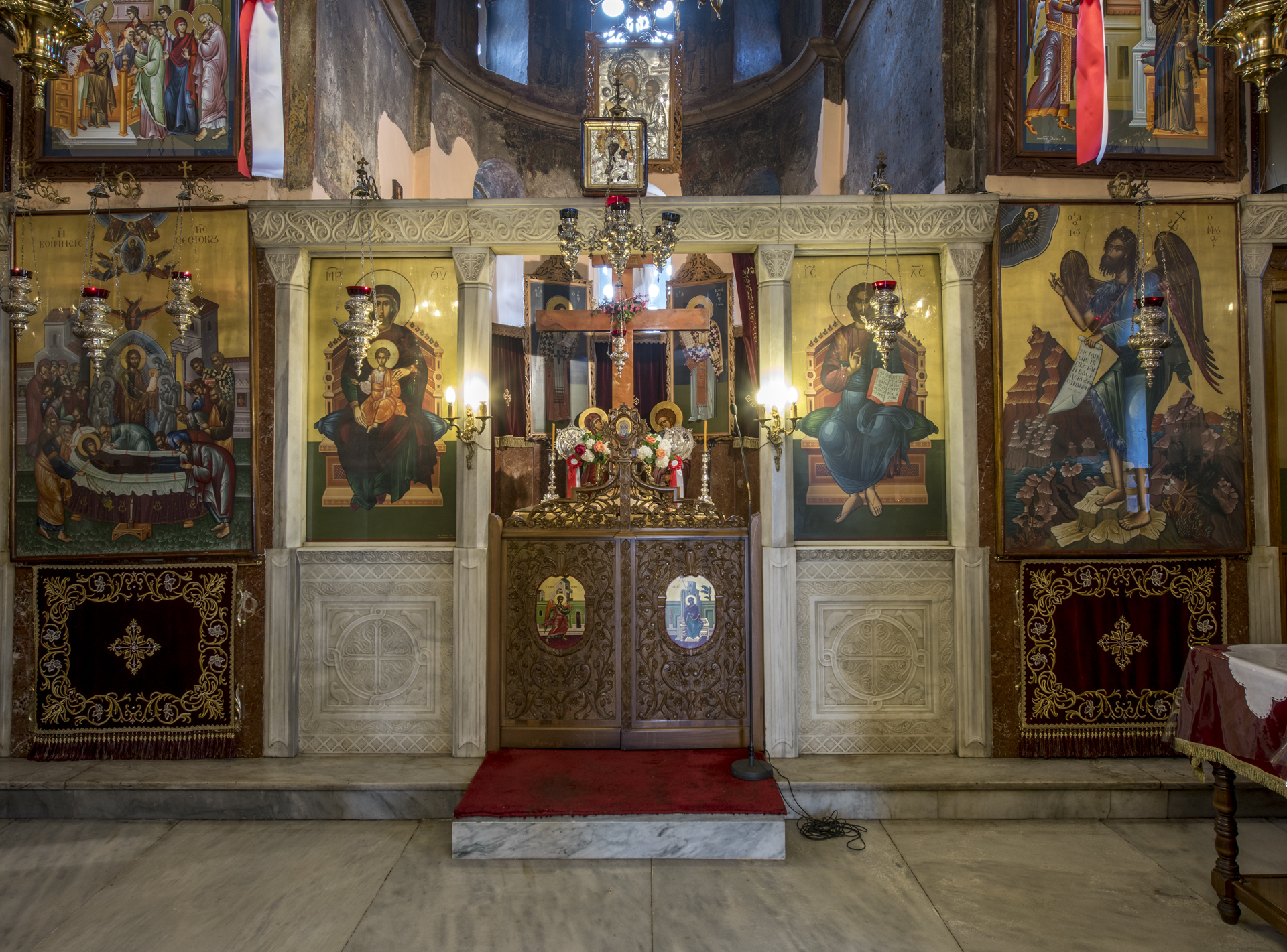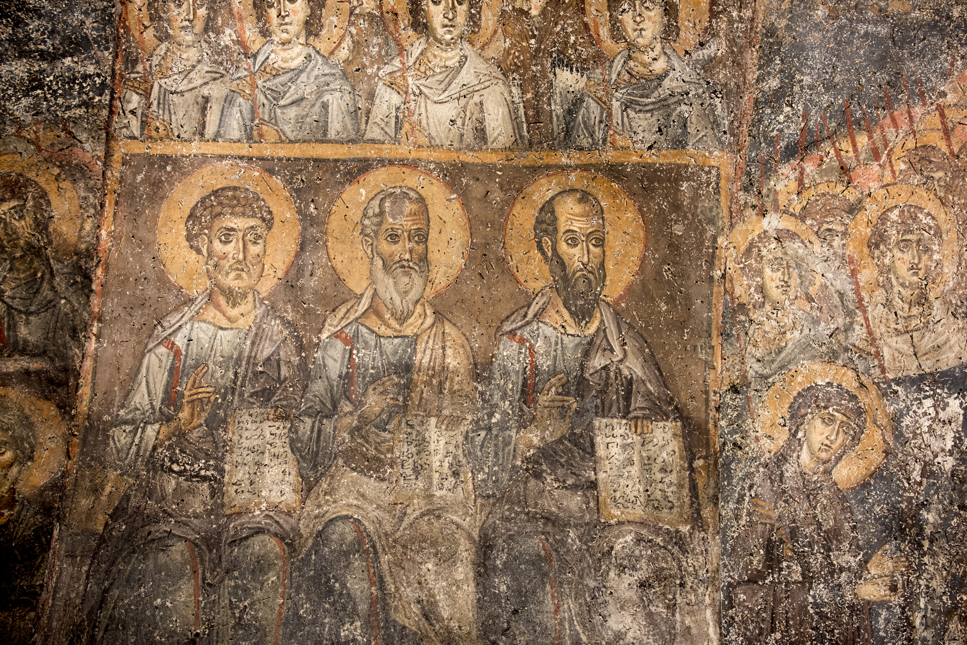 Οι τοιχογραφίες του ναού δε σώζονται σε καλή κατάσταση. Σώζονται λίγες χριστολογικές σκηνές στον κυρίως ναό (Γέννηση, Υπαπαντή, Προσκύνηση των Μάγων, Πεντηκοστή) και λειτουργικές στο ιερό βήμα, όπου η Πλατυτέρα δεομένη. Πρόκειται όμως για ένα από τα σημαντικότερα τοιχογραφικά σύνολα, το οποίο σύμφωνα με την επιγραφή ταυτίζεται χρονολογικά με την ίδρυση του ναού.