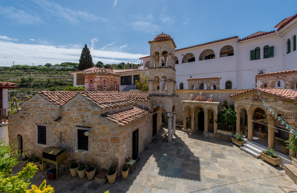 Το συγκρότημα της μονής αποτελείται από βυζαντινά και νεότερα κτίσματα, που οικοδομήθηκαν μετά το 1930 για να καλύψουν τις ανάγκες των μοναχών. Το καθολικό, που χρονολογείται στον 12ο αιώνα, είναι μικρό σε διαστάσεις, ανήκει στον συνεπτυγμένο σταυροειδή εγγεγραμμένο τύπο και διαθέτει σπάνιες τοιχογραφίες του 12ου αιώνα, κυρίως λαϊκού ύφους, αλλά και αξιόλογες νεότερες, του 16ου ή 17ου αιώνα. Το κωδωνοστάσιό του είναι ενωμένο με τον πρόναο και στηρίζεται σε κίονες που ανήκουν σε αρχαίο ή παλαιοχριστιανικό κτίσμα. Στη βόρεια πλευρά του ναού έχει προσαρτηθεί παρεκκλήσιο, ενώ στο νότιο μέρος του βρίσκεται ο τάφος του Αγίου Ιερόθεου και δίπλα του το θολωτό μνημείο που ανήγειραν οι μοναχοί σε ανάμνηση της διασωσής τους από τους πειρατές. Στη βυζαντινή εποχή χρονολογείται και το φωτάναμμα, ο καμαροσκεπής θερμαινόμενος χώρος συγκέντρωσης των μοναχών, απέναντι από το καθολικό, ο οποίος σήμερα χρησιμοποιείται ως τράπεζα. Σώζονται, ακόμη, δύο πτέρυγες με κελιά και άλλους βοηθητικούς χώρους, που είχαν θολωτές στέγες, μικρά παράθυρα και χαμηλές πόρτες.
