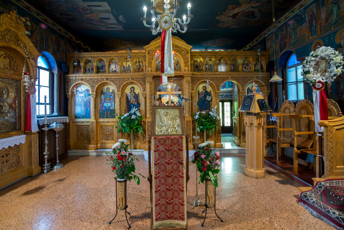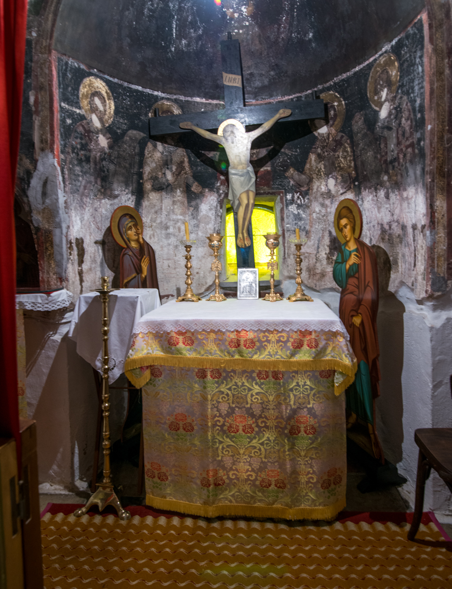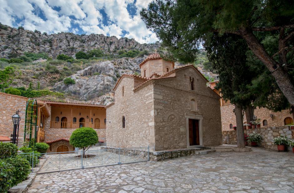 Το συγκρότημα είναι οργανωμένο γύρω από το καθολικό, μια μικρή μονόκλιτη καμαροσκεπή βασιλική που χρονολογείται στον 16ο αιώνα και δεσπόζει ακριβώς απέναντι από την είσοδο. Είναι αφιερωμένο στην αποτομή της κεφαλής του Αγίου Ιωάννη του Πρόδρομου και το εσωτερικό του είναι διακοσμημένο με αξιόλογες τοιχογραφίες, που όπως μας πληροφορεί η σχετική επιγραφή, είναι έργα του 1572. Στη μονή υπάρχει και δεύτερος ναός, επίσης στον τύπο της βασιλικής, αφιερωμένος στους Ταξιάρχες. Είναι διακοσμημένος με σύγχρονες αγιογραφίες βυζαντινής τεχνοτροπίας και εορτάζει στις 8 Νοεμβρίου.