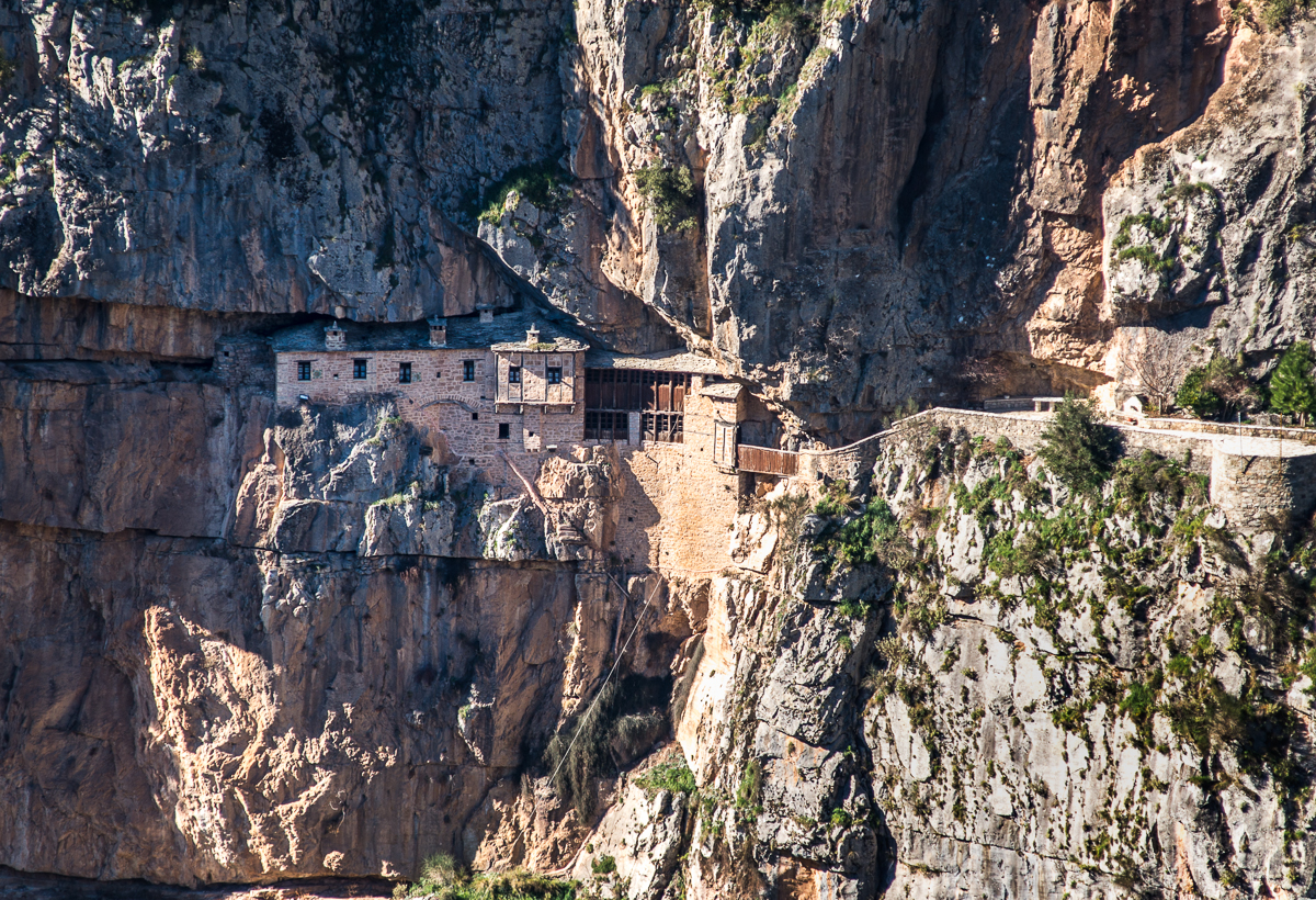Η πρόσβαση στη μονή γίνεται από ένα μονοπάτι που είναι λαξευμένο στον βράχο και μια κρεμαστή ξύλινη γέφυρα, την οποία σήκωναν οι μοναχοί για να αποκόπτουν την πρόσβαση. Το καθολικό έχει ως στέγη τον φυσικό βράχο, που έχει λαξευτεί έτσι ώστε να σχηματίζει θόλο. Είναι μικρή μονόκλιτη βασιλική με νάρθηκα και στο εσωτερικό σώζονται τοιχογραφίες που χρονολογούνται στα τέλη του 17ου ή στις αρχές του 18ου αιώνα. Το επιχρυσωμένο ξύλινο τέμπλο και οι εικόνες του Ιωάννη από την Σαγιάδα είναι έργα του 18ου αιώνα.