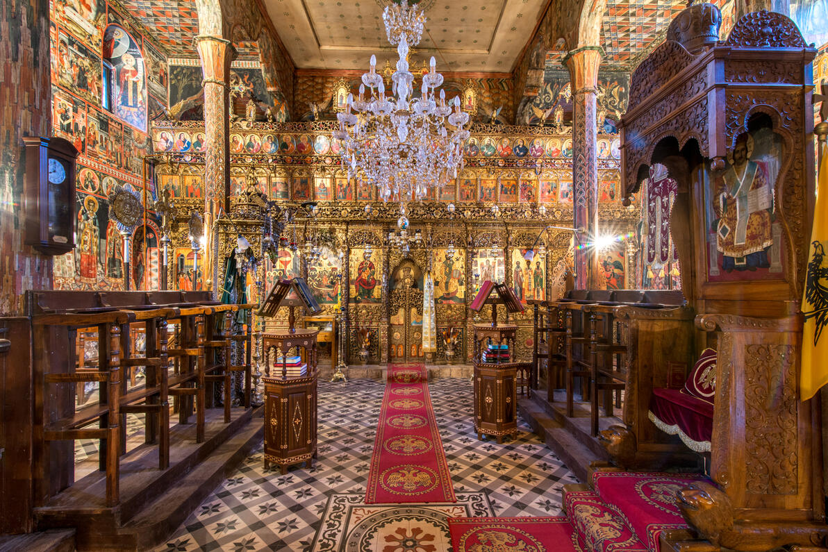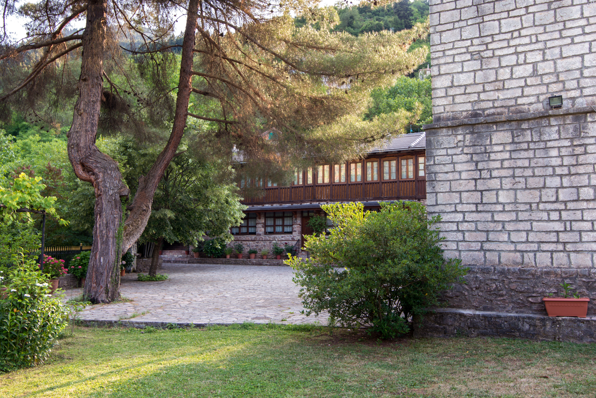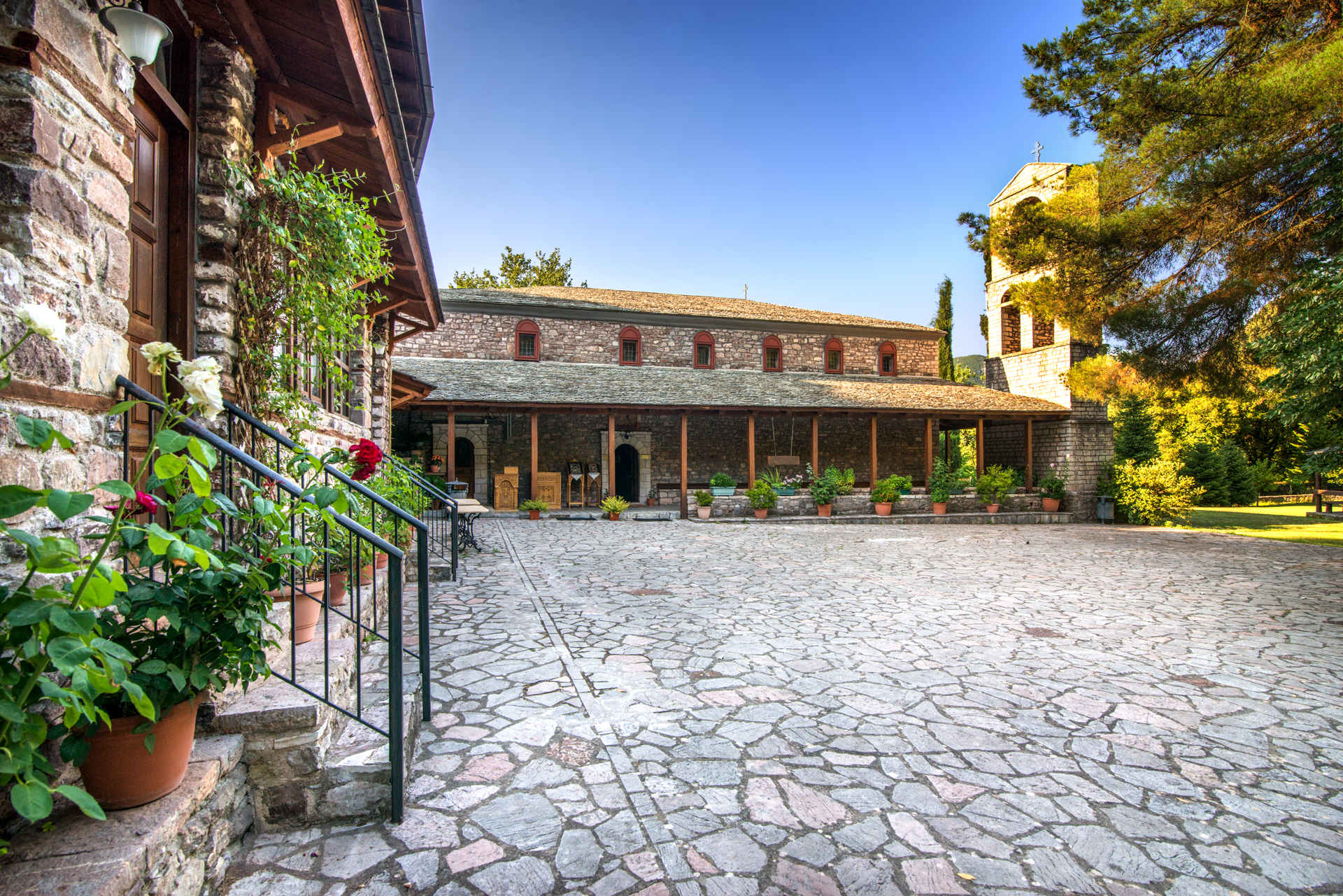 Το συγκρότημα διαθέτει κτήρια κελλιών, το πανύψηλο κωδωνοστάσιο, που φθάνει τα 18 μ., και ευρύχωρο προαύλιο με επιβλητικά κυπαρίσσια. Το καθολικό είναι τρίκλιτη βασιλική και αποτελεί το μοναδικό δείγμα αυτού του αρχιτεκτονικού τύπου που διατηρείται στην Ευρυτανία. Στη δυτική πλευρά έχει νάρθηκα, από τον οποίο ξεκινά ξύλινη σκάλα που οδηγεί στον γυναικωνίτη. Οι τοίχοι του είναι κτισμένοι με ντόπιες πέτρες και ξυλοδεσιά και η στέγη του στηρίζεται σε δέκα κίονες σχηματισμένους από κορμούς δέντρων. Στο εσωτερικό του οι τοίχοι διακοσμούνται με σημαντικές αγιογραφίες, που θεωρούνται έργα των ζωγράφων Γεωργίου Γεωργίου και Γεωργίου Αναγνώστου, μαθητών του ιερομόναχου αγιογράφου Διονυσίου εκ Φουρνά. Ξεχωριστή εντύπωση προκαλεί η οροφή, διακοσμημένη με γεωμετρικά μοτίβα και παραστάσεις λαϊκής τεχνοτροπίας, και το θαυμάσιο ξυλόγλυπτο τέμπλο, έργο του 1759 «διά χειρός Αθανασίου», επιχρυσωμένο το 1880 από τους αδελφούς Σαρρή από το Νεοχώρι Τυμφρηστού.
