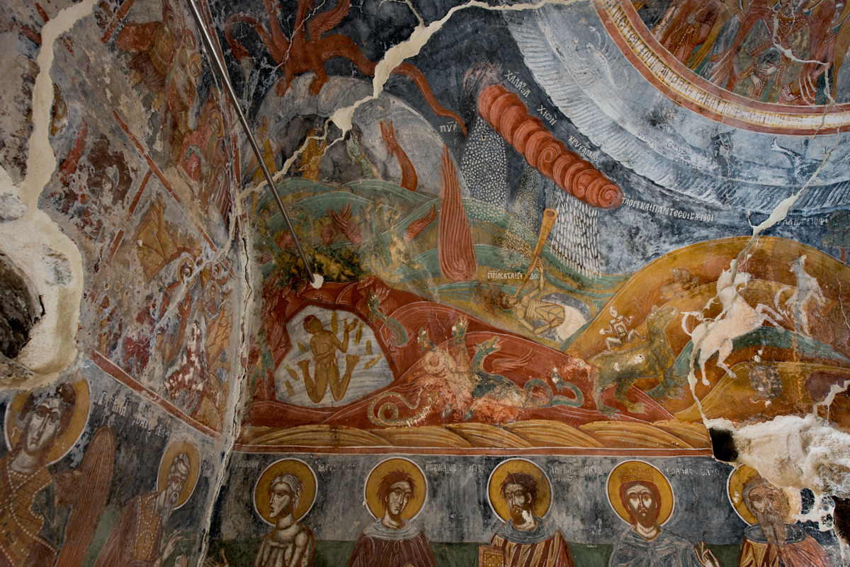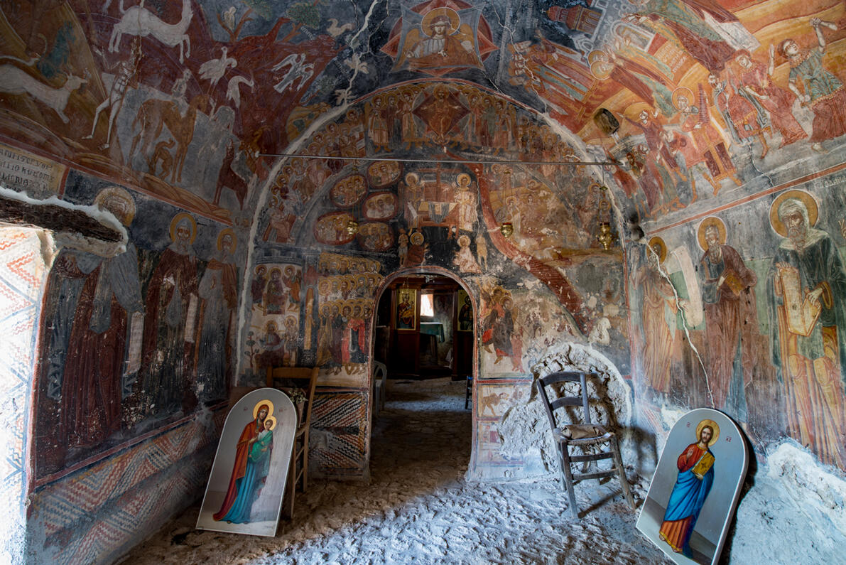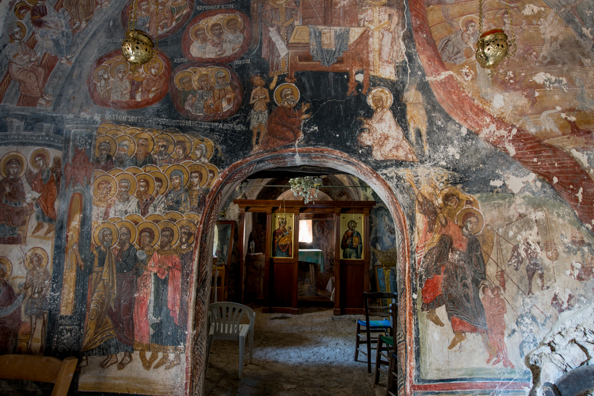 Εσωτερικά διακοσμείται με θαυμάσιες τοιχογραφίες που ανήκουν σε δύο περιόδους: οι παραστάσεις του κυρίως ναού και του ιερού χρονολογούνται στον 17ο αιώνα, ενώ η εικονογράφηση του νάρθηκα έχει γίνει το 1716, όπως μας ενημερώνει σχετική επιγραφή.