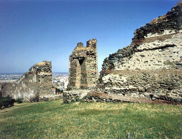 Τμήματα από τα βυζαντινά τείχη, που διατηρήθηκαν και στην περίοδο της Τουρκοκρατίας, προβάλλουν σε διάφορα σημεία της σύγχρονης Θεσσαλονίκης, δίνοντας την ατμόσφαιρα άλλων εποχών. Προστάτευαν το μεγαλύτερο μέρος της πόλης, είχαν ύψος 10-12 μέτρων και το μήκος τους έφθανε τα οκτώ χιλιόμετρα.