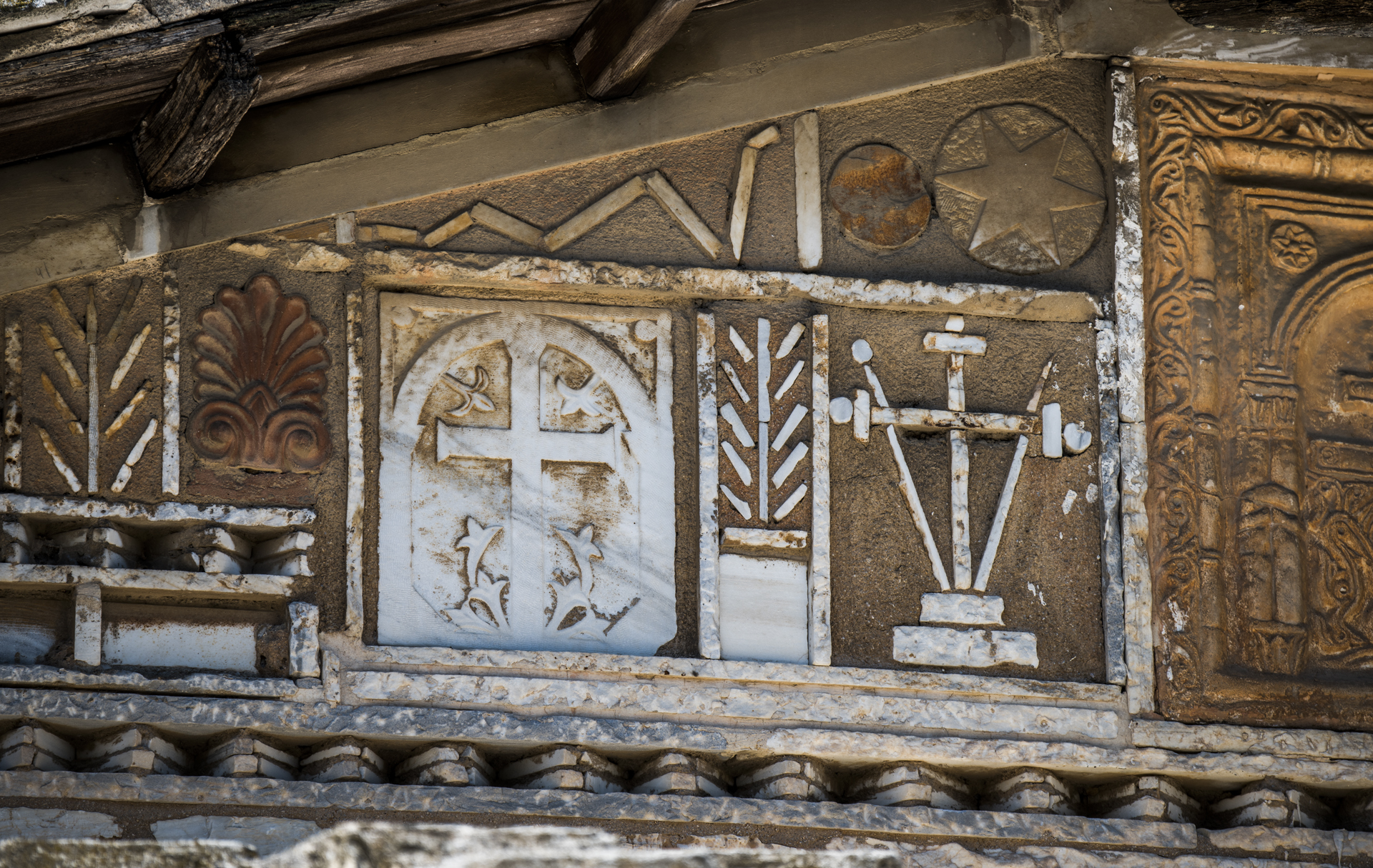 The Holy Altar is based on an ancient column, while another two columnettes are situated in the courtyard of the main entrance. On the one column is inscribed in relief uncial writing: ‘ΒΕΡΕΝΙΚΗ ΙΣΙΔΩΡΟΥ ΜΗΛΙΣΙΑ ΜΑΙΝΑΝΔΡΟΥ ΑΙΘΑΛΙΔΟΥ ΓΥΝΗ [VERONIKI OF ISIDOROS MILETIAN THE WIFE OF MENANDROS ETHALIDIS]’ and on the other column: ‘ΠA(…)AΣ ΔΗΜΑΡΧΟΥ ΠΑΛΛΗΝΕΩΣ ΓΥΝΗ’ [‘PA(…)AS THE WIFE OF DIMARCHOS PALLINEFS’].