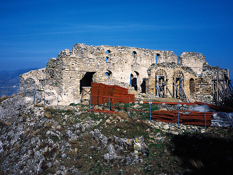 Somewhat lower, at the northwestern section of the precinct of the castle, is the church of Agioi Theodoroi, from the second half of the 11th century. it was the catholicon of a stauropegic monastery, from which today survive only ruins of the precinct and the vaulted roofed water reservoir. The church is aisleless with wooden roof and externally its walls are decorated with ceramic decoration. At its interior and exterior on the western wall survive the wall paintings of 1497, representative examples of the Macedonian art of the end of the Byzantine period and the beginning of the Turkish occupation. They are the works of two painters and are related in style to the workshop of Kastoria.