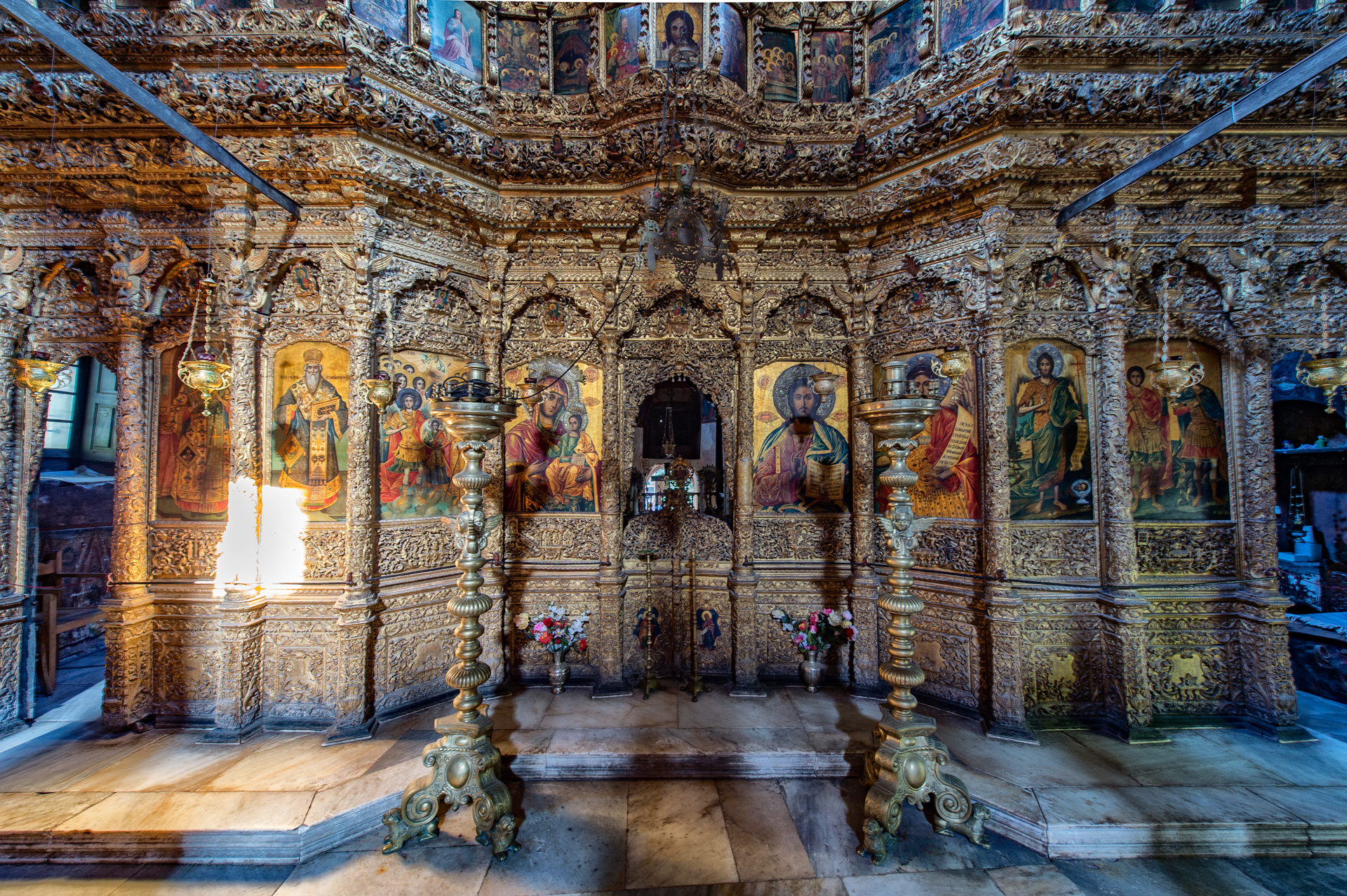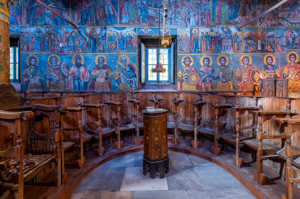 Ici, le visiteur peut aussi admirer les belles fresques qui ornent l’intérieur de monastère et qui datent du XVIe – XVIIe siècle. L’iconostase de l’ église est en bois peint, doré et sculpté selon le style baroque othomanien.