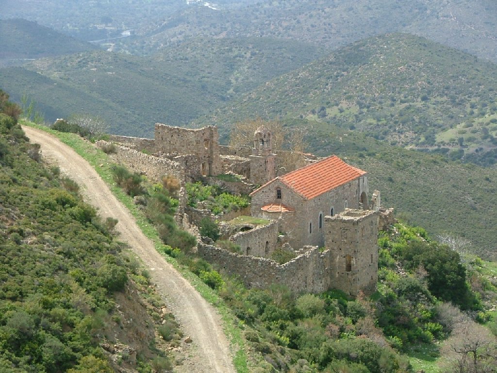 La tradition fait remonter sa fondation aux temps byzantins, mais la première mention existe dans des sources écrites et date de 1574, tandis que sa rénovation a été réalisée par le moine Iakovos Lagadiotis. Le monastère dépendait directement du Patriarcat et a évolué de manière notable entre le XVIIe et le XIXe siècle. Il a même évolué au point de devenir le second centre monastique le plus important de Chios après la Néa Moni. Il possédait une grande fortune et une riche bibliothèque, et devint un centre d’études théologiques, en accueillant d’importants hommes de lettres et des célébrités originaires de Chios. Il a été détruit en 1822, par les turcs, rénové et de nouveau détruit par le grand séisme de 1881, évènement qui marqua le début de son déclin et son abandon progressif.